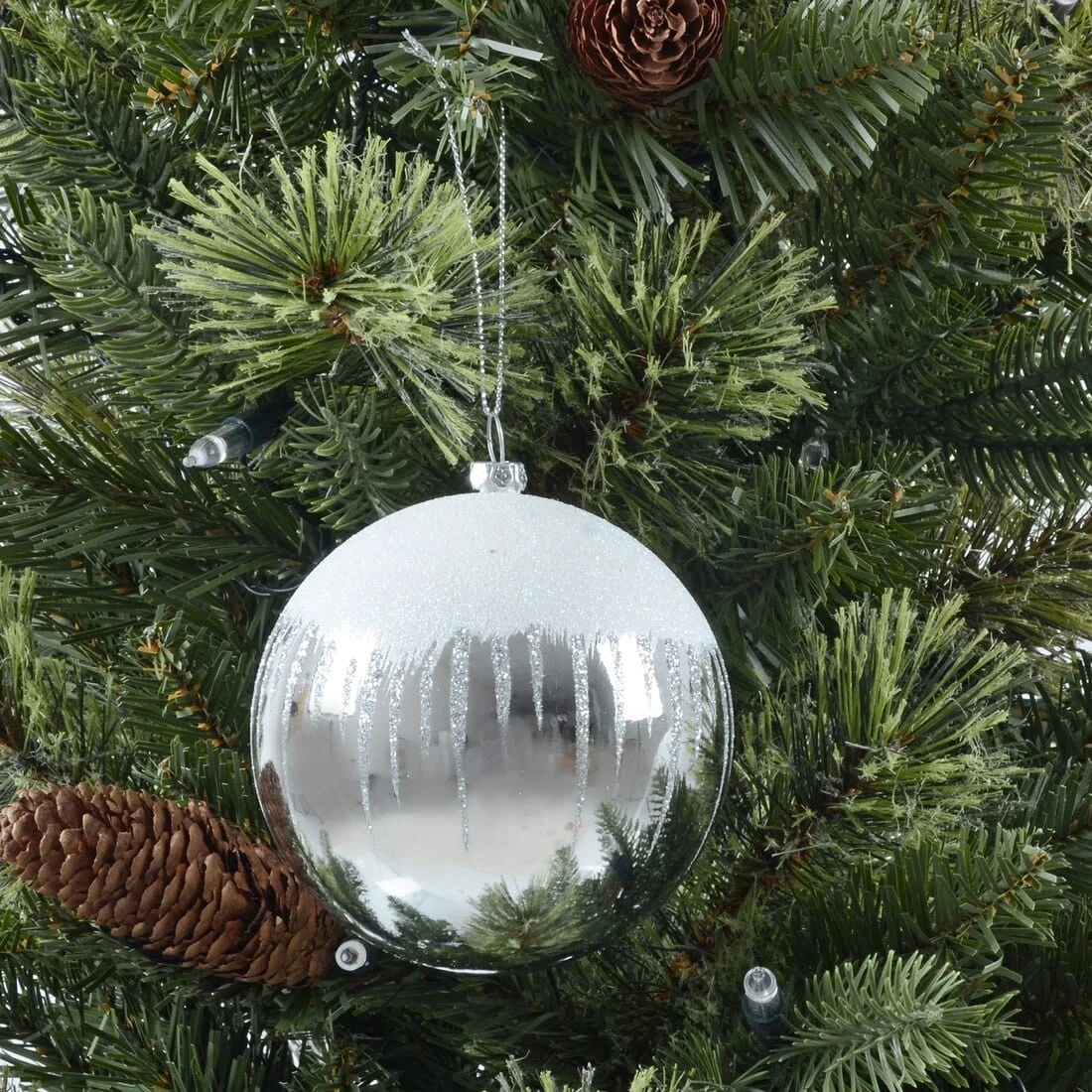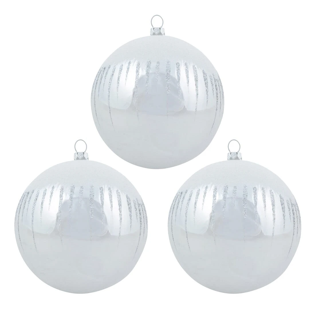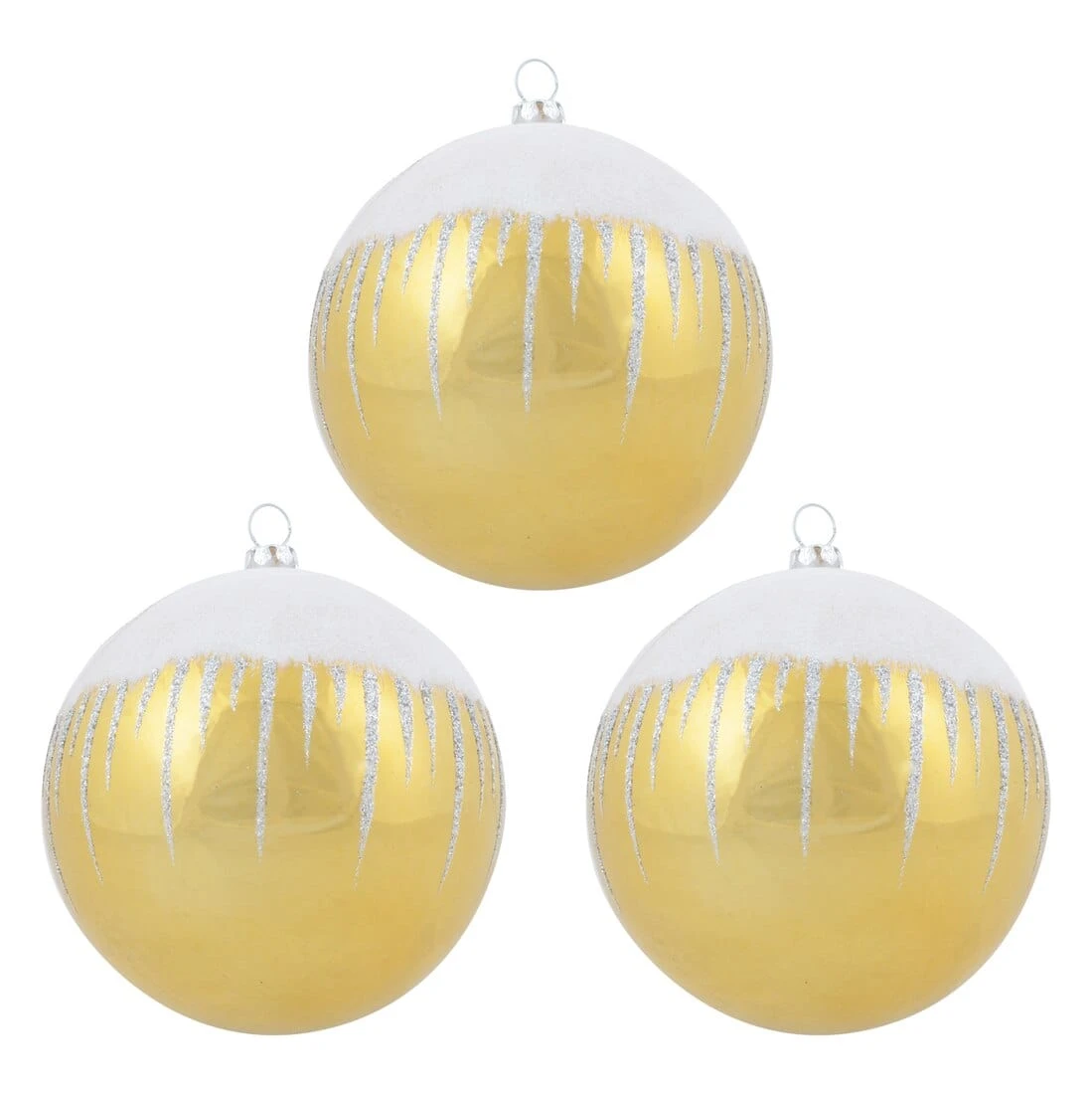 Each set comes with three round mirror finish baubles, each styled white glistening snow on the top and glittery drips round the sides. The baubles all have a diameter of 10cm and are finished with a silver cap and silver hanging thread. Choose from silver, red and gold.