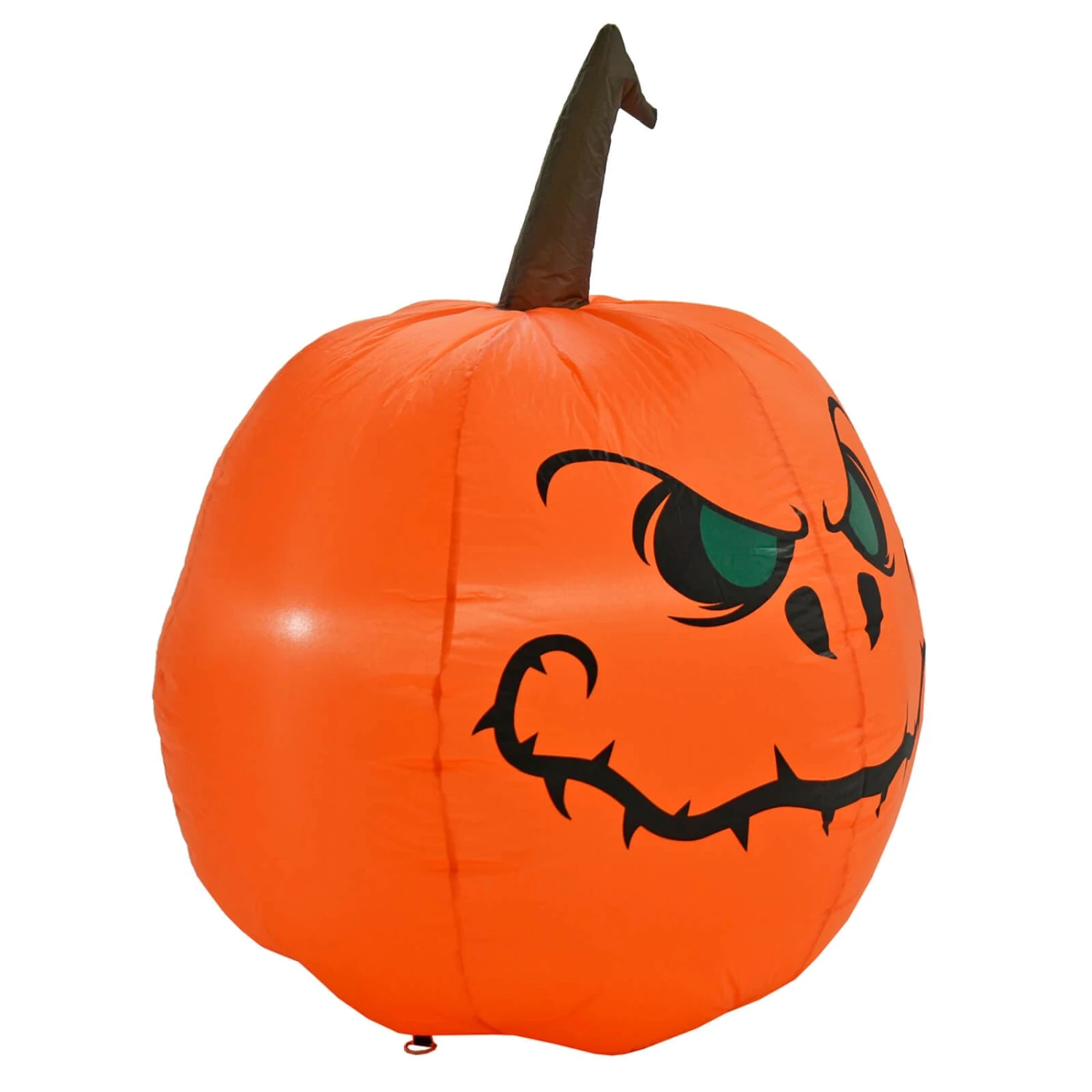 The inflatable orange pumpkin has green eyes and an evil grin. This Halloween party decoration is lit by a white LED and is 1.16m (4ft) high. Suitable for indoor and outdoor use.