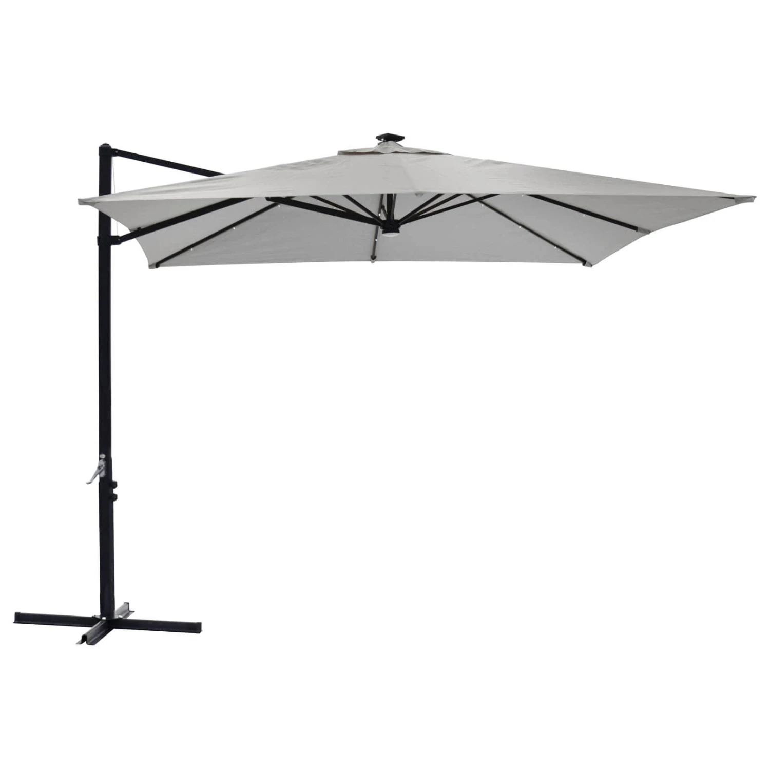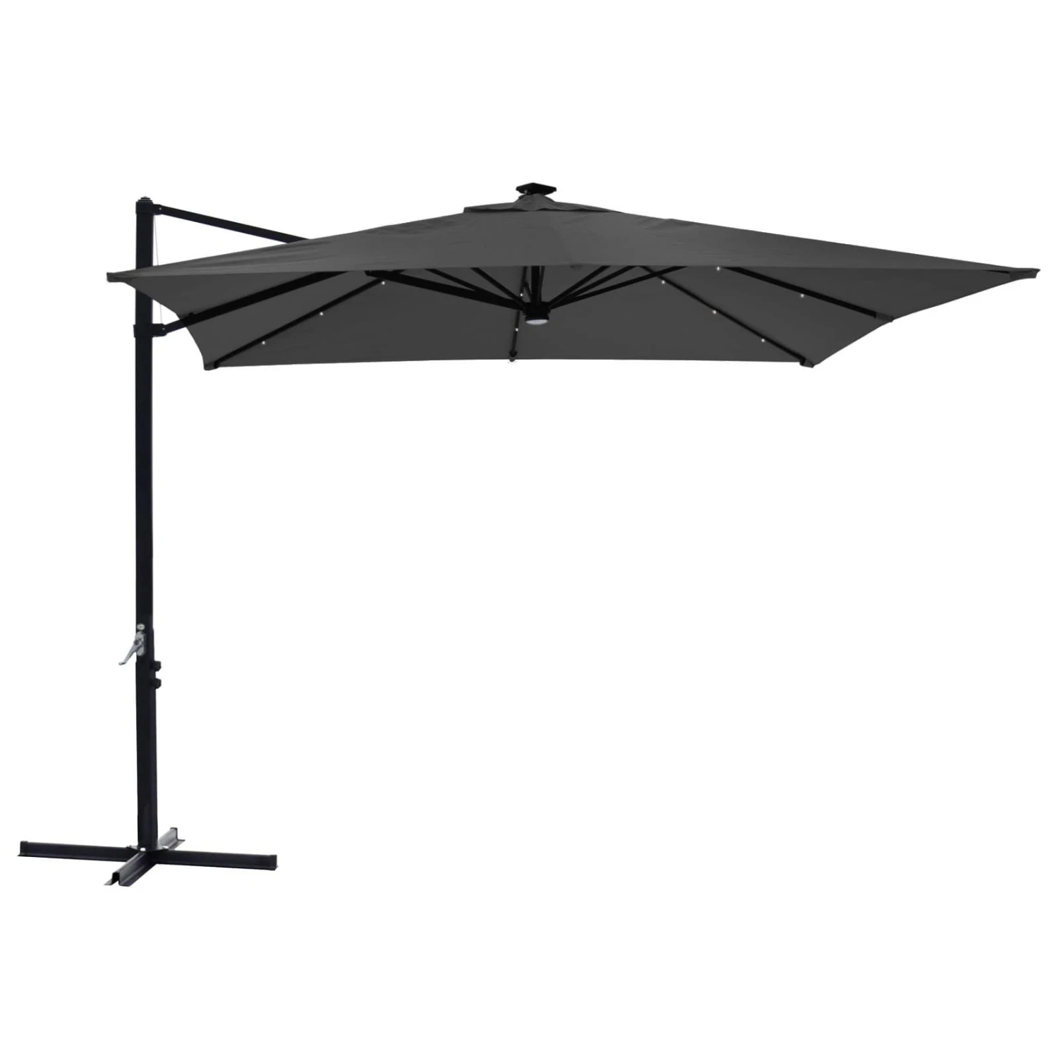 The cantilever bistro-style sun parasol has 25 white solar-powered LED lights on the canopy.