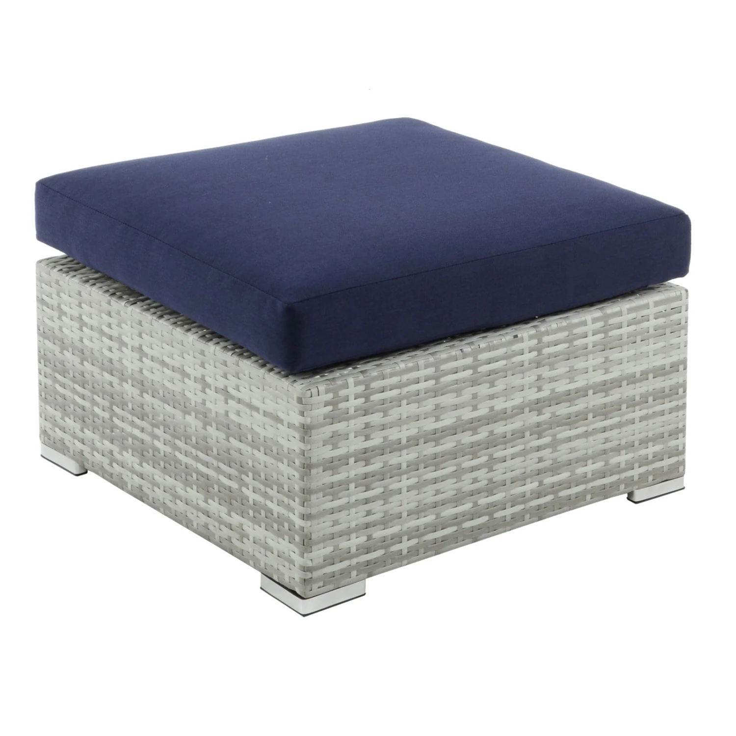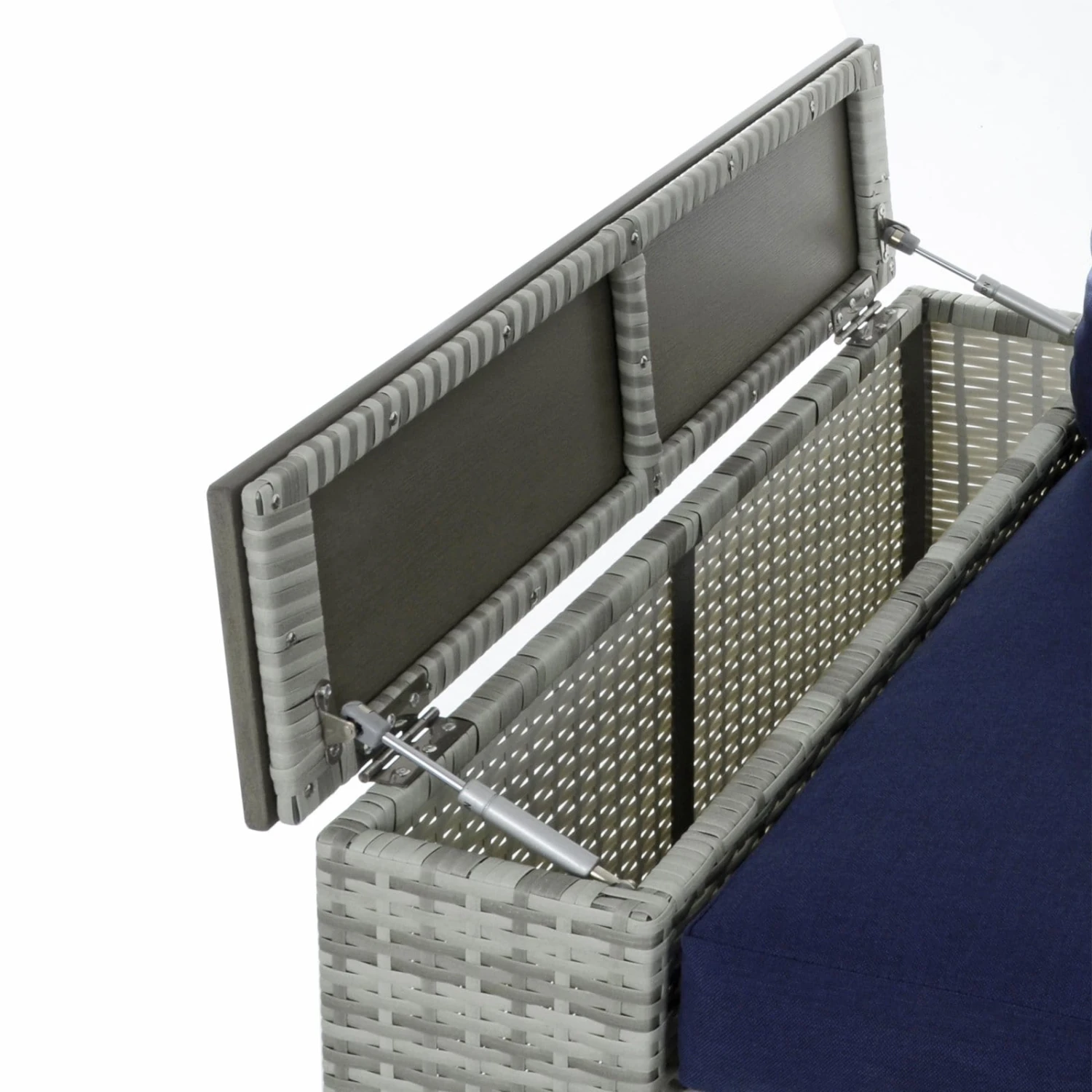 Add a touch of the Greek Med to your garden with this 2 seater sofa and sun lounger set. The two tone grey rattan weave garden furniture comes with navy blue cushions, matching ottoman seat and side tables with storage space. The lounger can be set to 4 positions so you can relax outdoors in comfort and style this summer!
