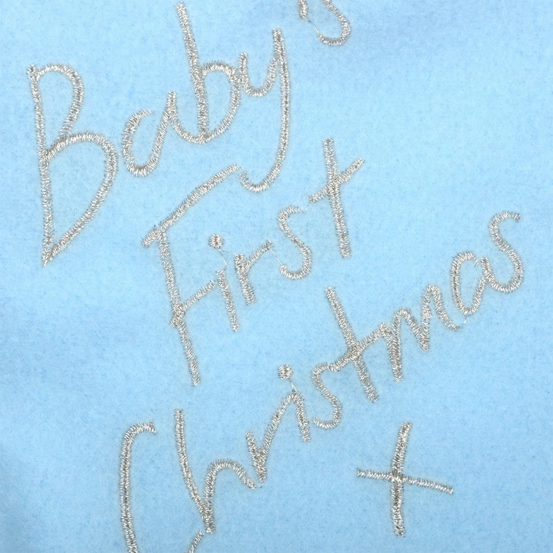 Celebrate baby’s first Christmas with this festive stocking. Made from soft blue fleece fabric, it features silver embroidered “Baby’s 1st Christmas” text on the front and blue stars on the white cuff.