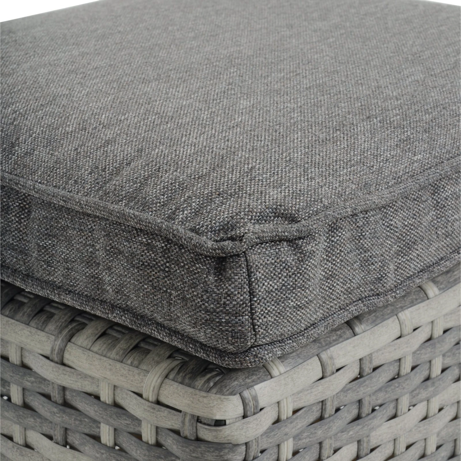 The luxurious, two tone, grey rattan Barletta Sofa Dining Set will seat 7 adults and includes a 3 seater sofa, 2 armchairs, 2 ottoman seats and a glass topped dining table. Comes with grey seat pads and button tufted back cushions.