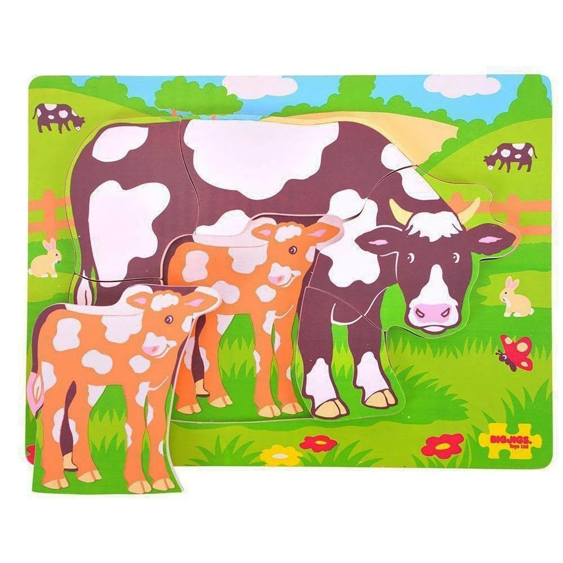 This chunky puzzled features a cow and calf design that your little one is going to love. The 6 pieces are thick and easy for small hands to use and slot easily into the colourful grass background.