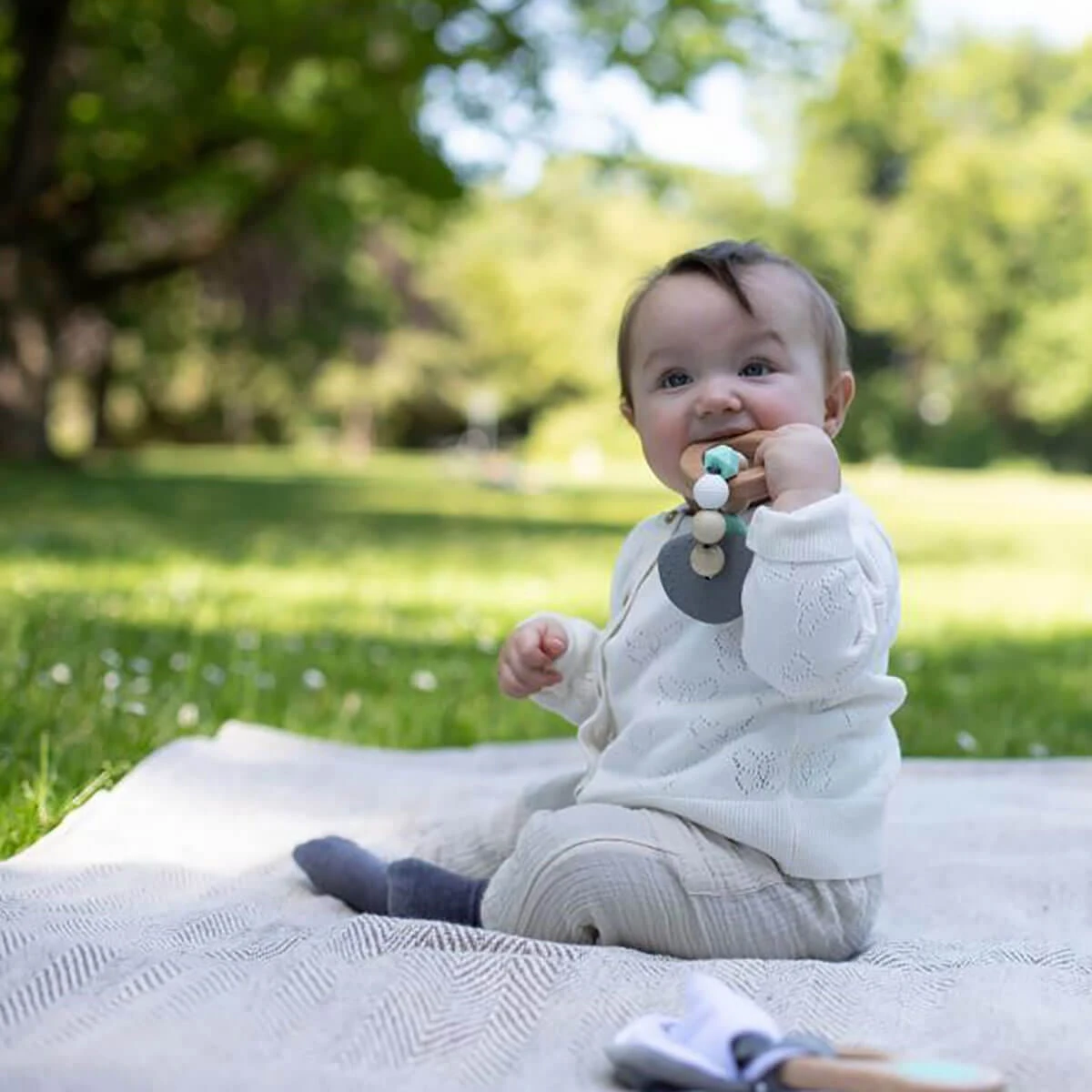 This high-quality teething ring made from wood offers a range of tactile stimuli. The assorted shapes and textures will help soothe your baby’s gums while teething. Suitable for babies 3 months+.