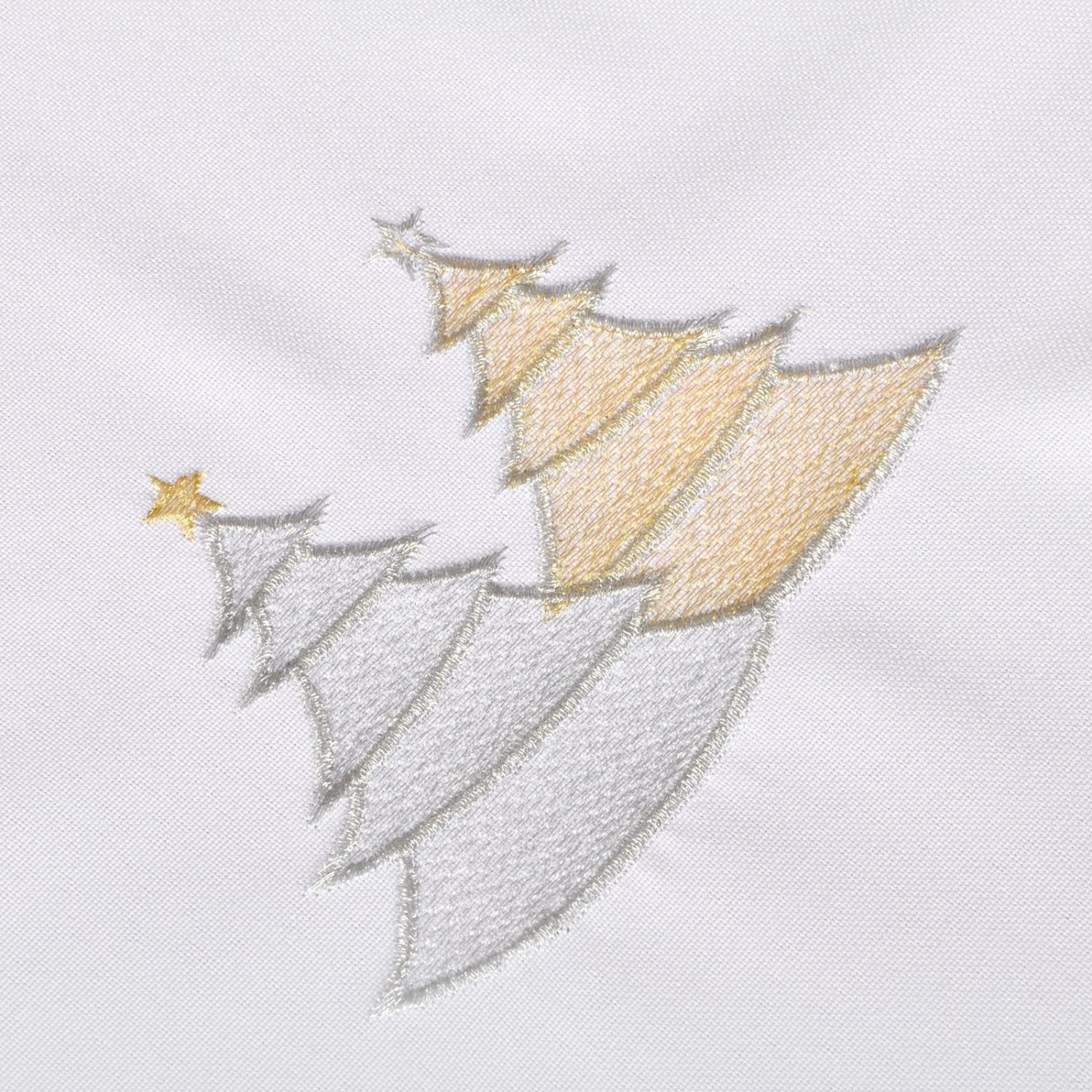 Xmas Tree – White: White tablecloth styled with a gold and silver embroidered Christmas tree design and stitched edges.