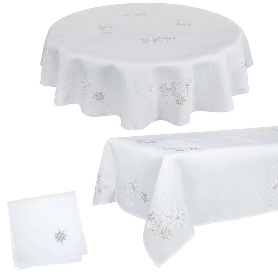 Snowflake – Red & White: Red and white tablecloths styled with a white and silver embroidered snowflake pattern.