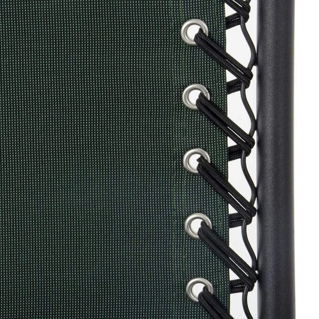 This Azuma zero gravity sun lounger seat is made from dark green hard wearing polyester. Padded with 2cm deep sponge for comfort. It’s waterproof, soft to sit on and easy to clean with a damp cloth and warm soapy water. The seat is attached to a strong black powder coated tubular steel frame with elastic cords. The frame features black plastic arm rests and anti-rust screws with plastic caps.