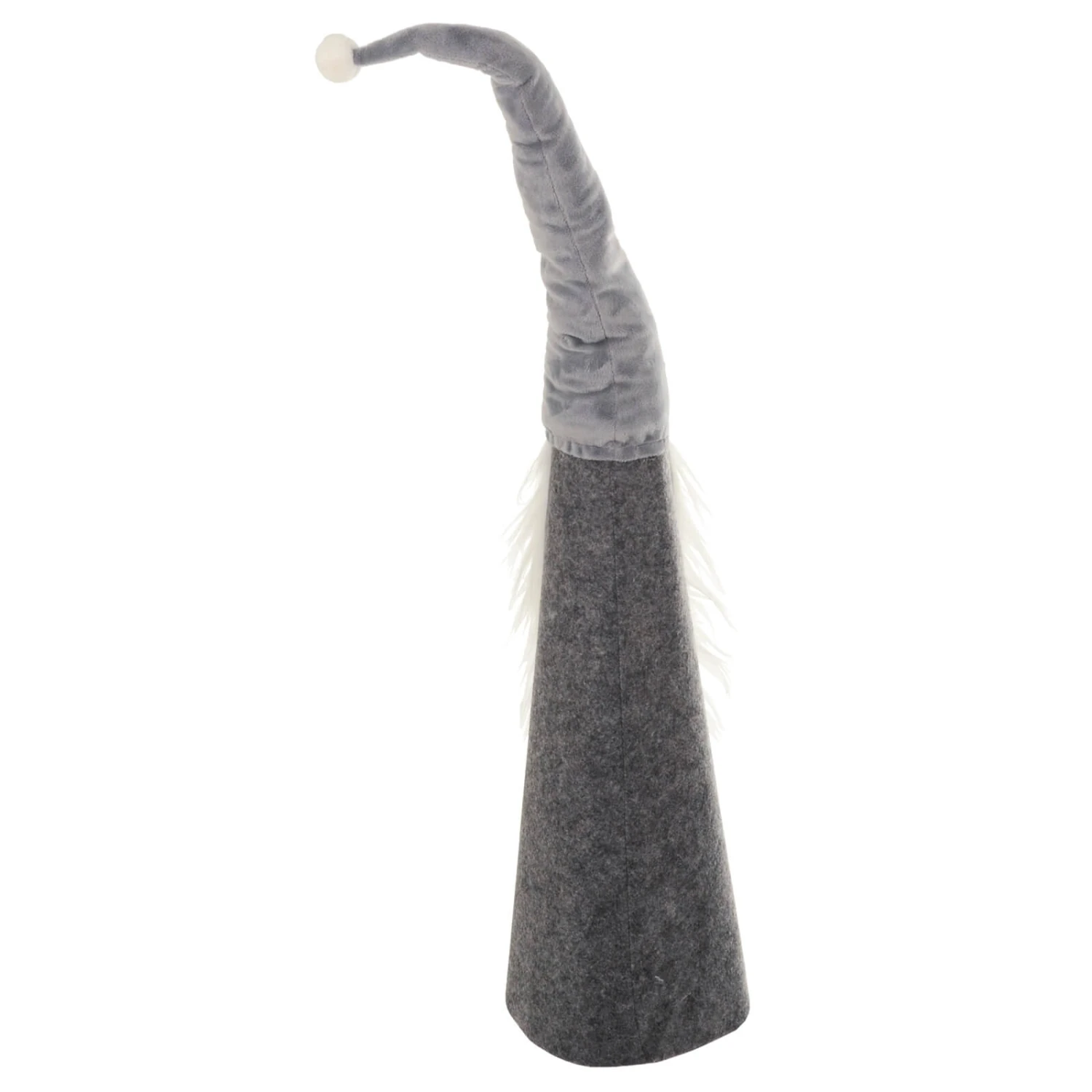 The novelty Christmas tree topper is a cone shaped Gonk character that fits neatly over the top of your tree. The large grey Christmas gnome is made from a card cone, decorated with grey and white fabrics. The hat has wire inside for you to pose.