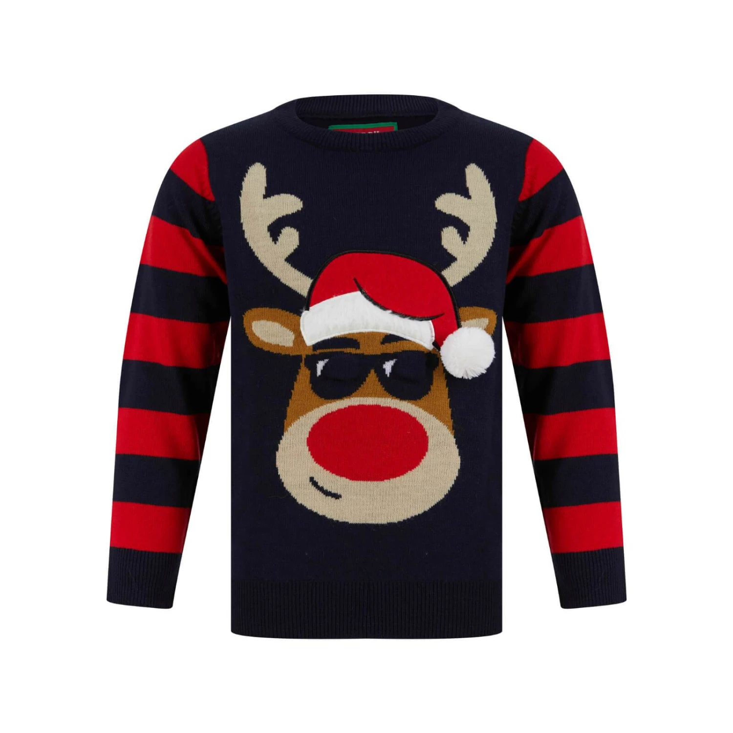 It features striped arms with a red-nosed reindeer on the front wearing a santa hat with faux fur trim and a 3D pom pom and a pair of cool shades that light up with multicoloured lights.