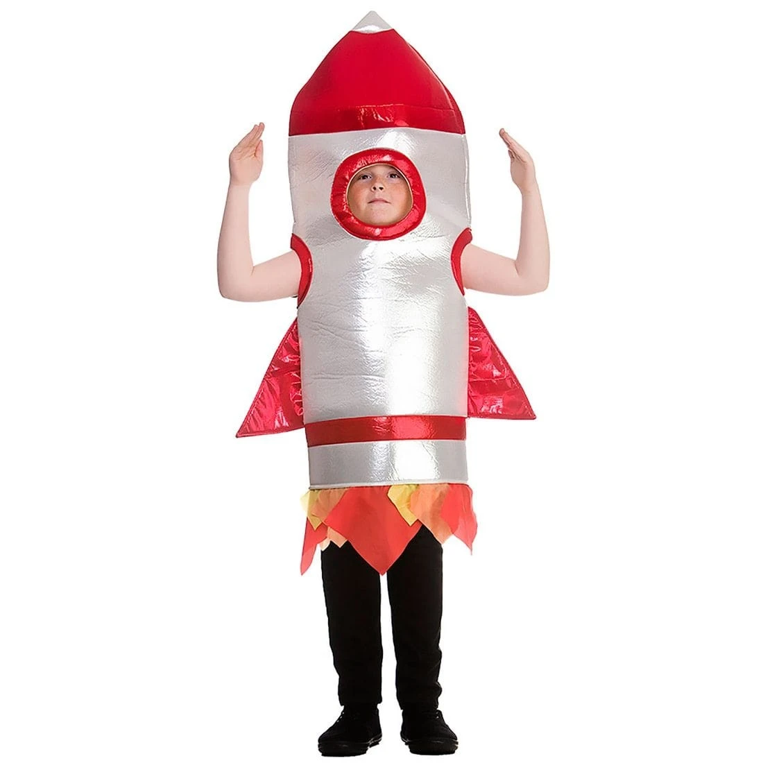 The child’s rocket costume features shiny metallic silver and red body with orange and red fabric flames.