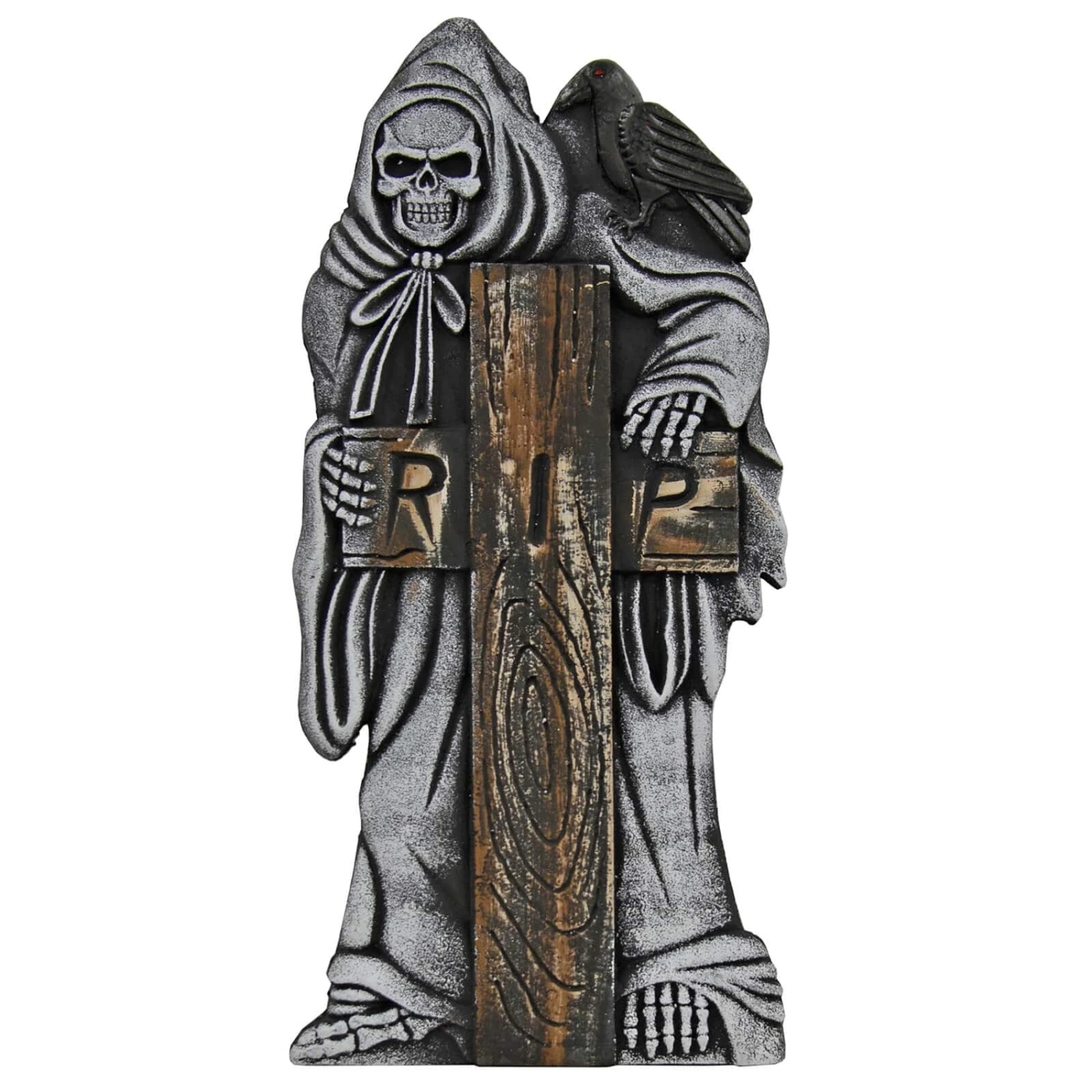 Create a spooky scene with this extra large 88cm (35.5″) tall headstone Halloween decoration. The tombstone is designed with a wood grain effect cross and a caped skeleton grim reaper figure with a crow on its shoulder. Made from water resistant polyfoam it’s suitable for indoor and outdoor use.