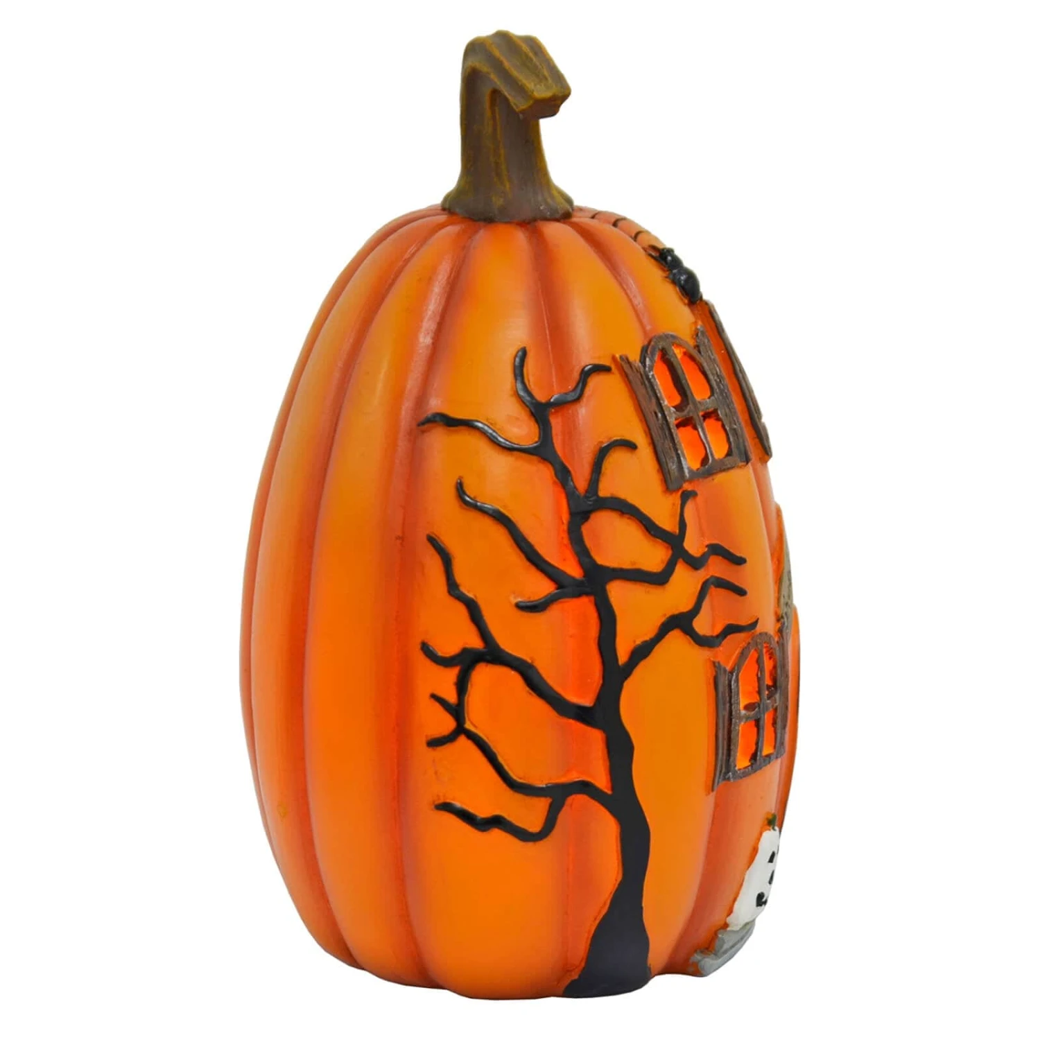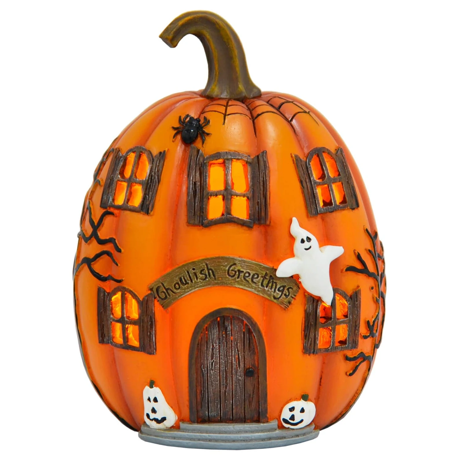 The orange Pumpkin House decoration is lit by 3 yellow LED lights. The finely detailed Halloween ornament is decorated with a ghost, pumpkins, trees, spider and web and a sign with Ghoulish Greetings.