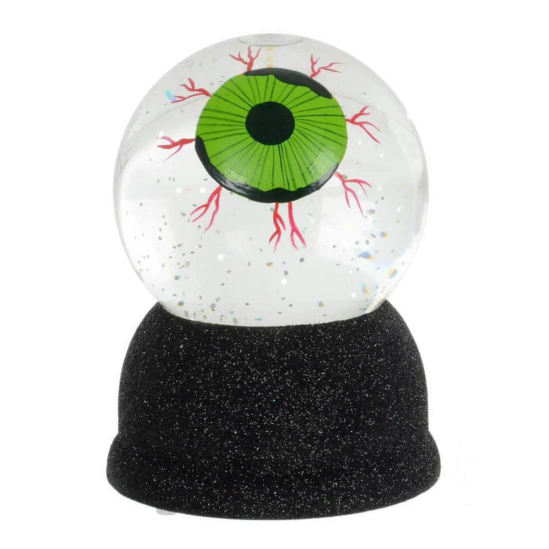 The transparent globe features a green or red eye on the front with red veins. A glittery black base completes this fantastic Halloween decoration.