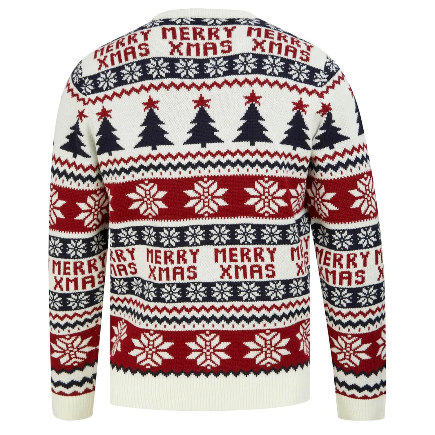 Make the most of the festive season with this traditional knit Christmas sweater. It features a Fair Isle style pattern with Christmas trees, snowflakes and Merry Xmas letters design.