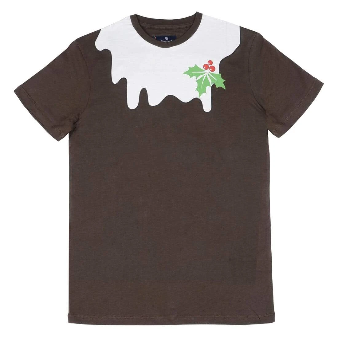Enjoy the Christmas festivities in this fun t-shirt for men. The dark brown tee is printed to look like a traditional Christmas pudding, with cream topping and holly leaves. This novelty Christmas t-shirt is available in men’s sizes from S, M, L, XL or XXL. Perfect for the office party and a great gift idea for the man in your life!