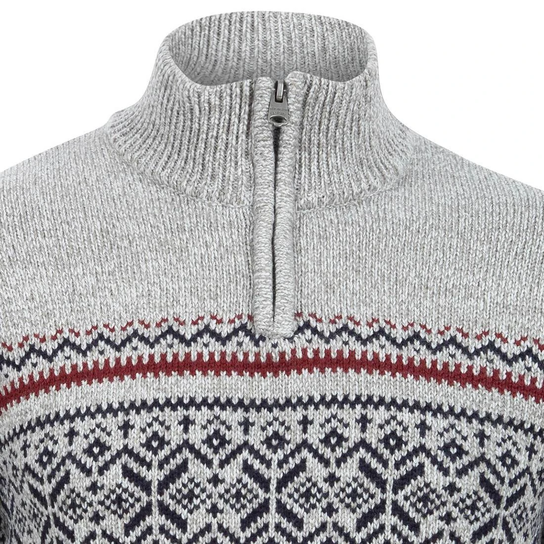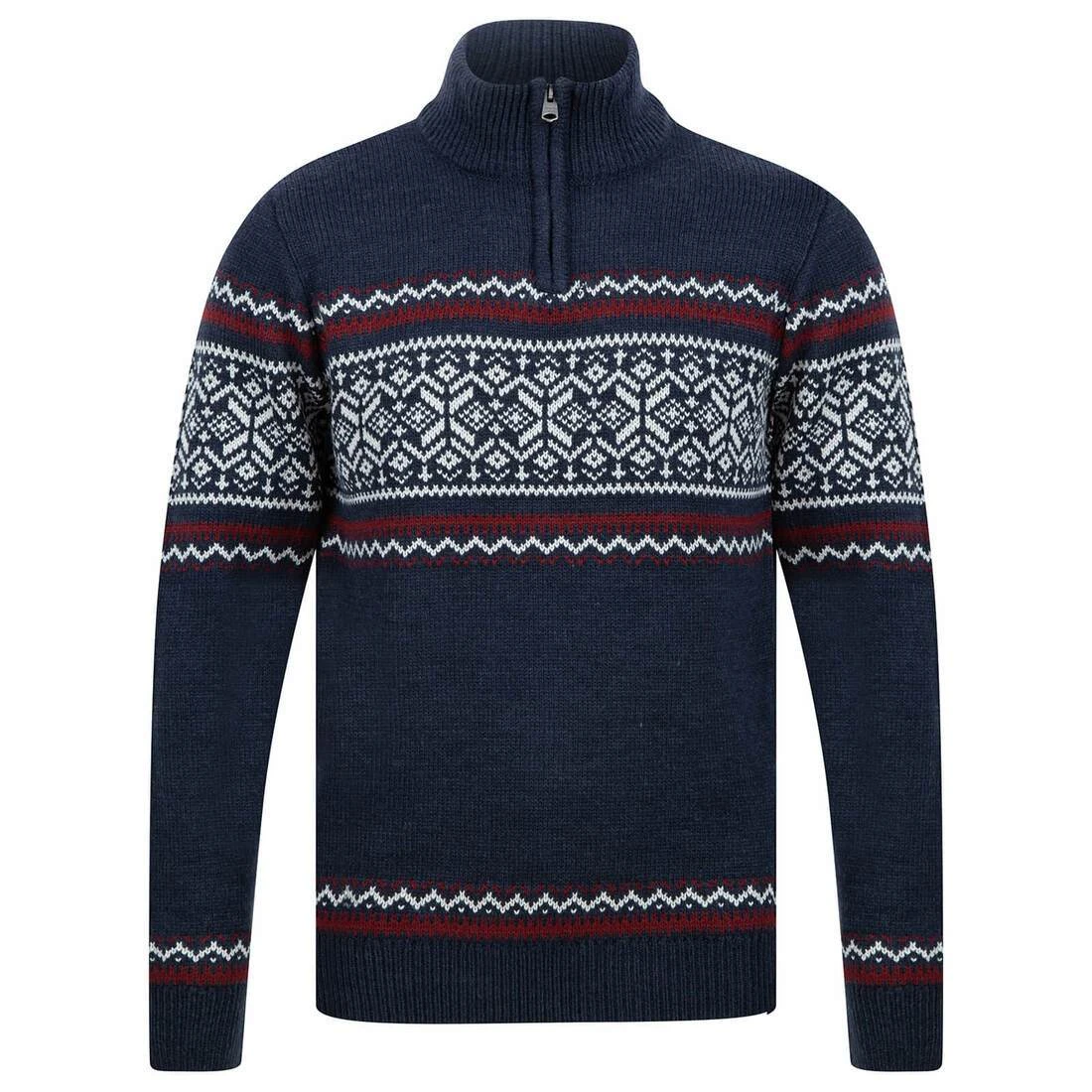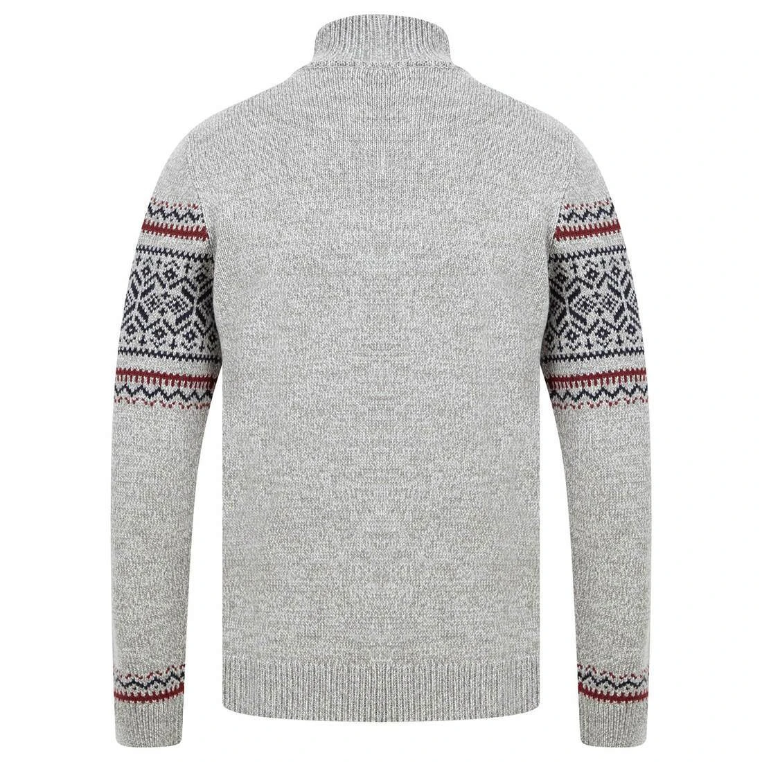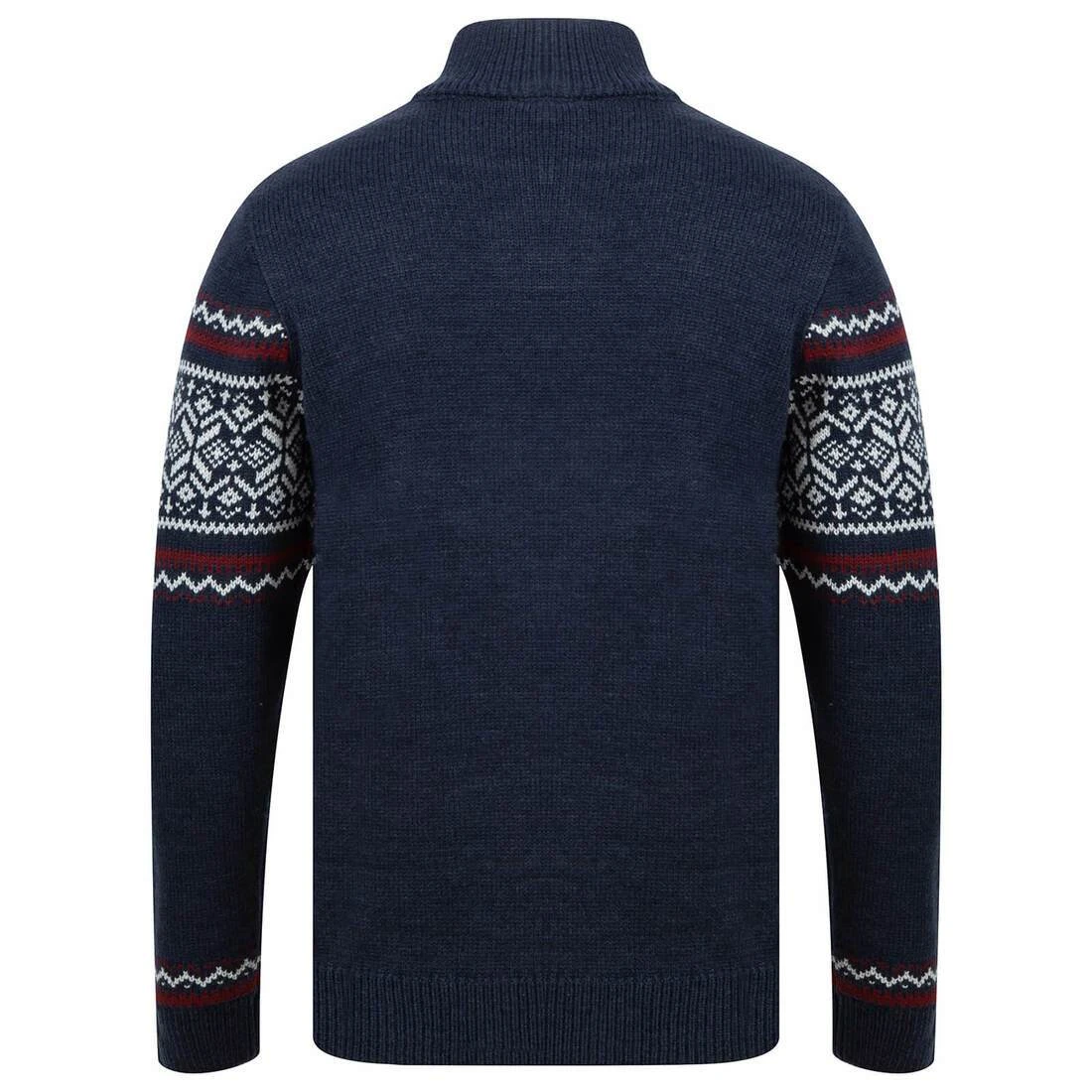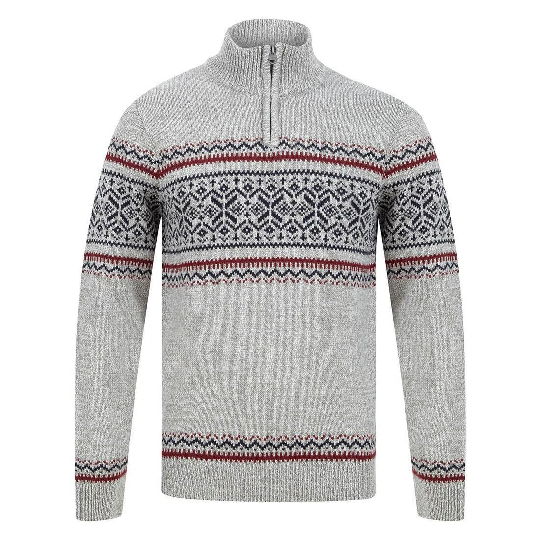 This traditional style Christmas sweater features fairisle snowflakes pattern bands across the chest and hems. The high neck has a zip fastening for comfort. This stylish Christmas jumper is available in grey marl or dark denim marl colours in mens sizes S, M, L, XL or XXL. Perfect for family seasonal celebrations, office parties and a great gift idea for the man in your life!