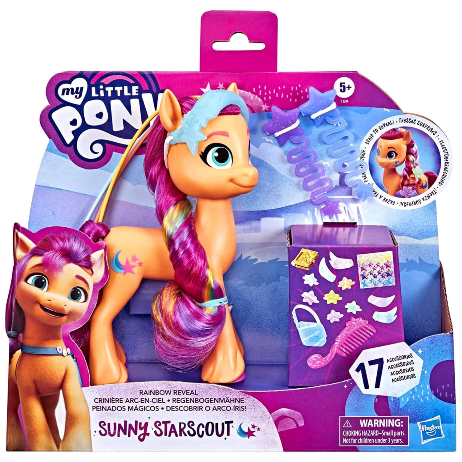 The 15cm (6″) Sunny orange pony figure has a character-inspired shooting star Cutie Mark on one side. The My Little Pony has soft, long pink hair for lots of hair play fun. Includes a braiding tool can be used to style her hair into a braid, revealing a colourful rainbow pattern as you go.