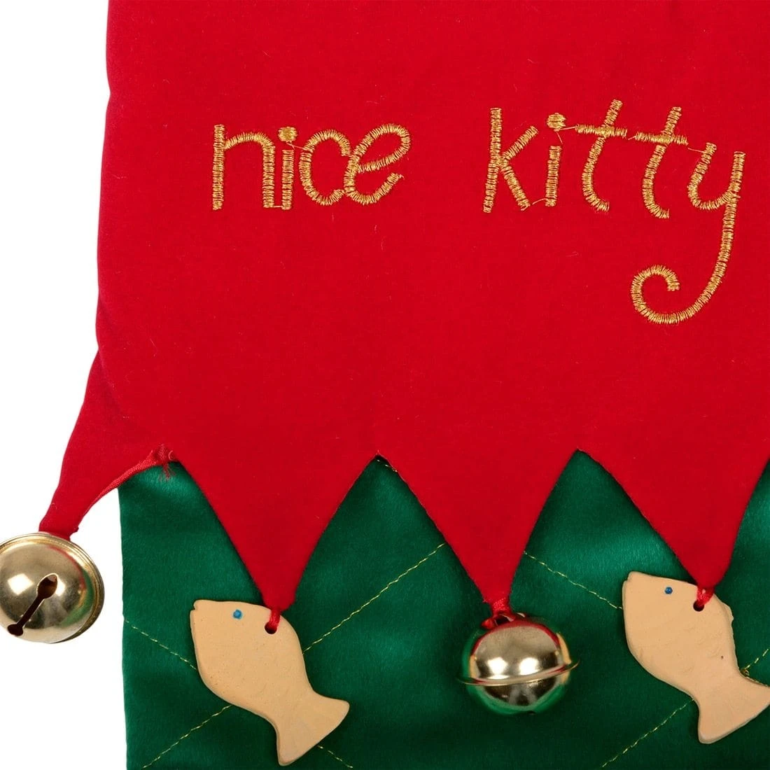 Who said Christmas was just for us humans? Treat kitty to some new toys and tasty snacks on Christmas morning, presented in this fun festive stocking. The stocking is made from green velvet effect fabric with a red collar. Decorated with mini fish ornaments and jingly bells.