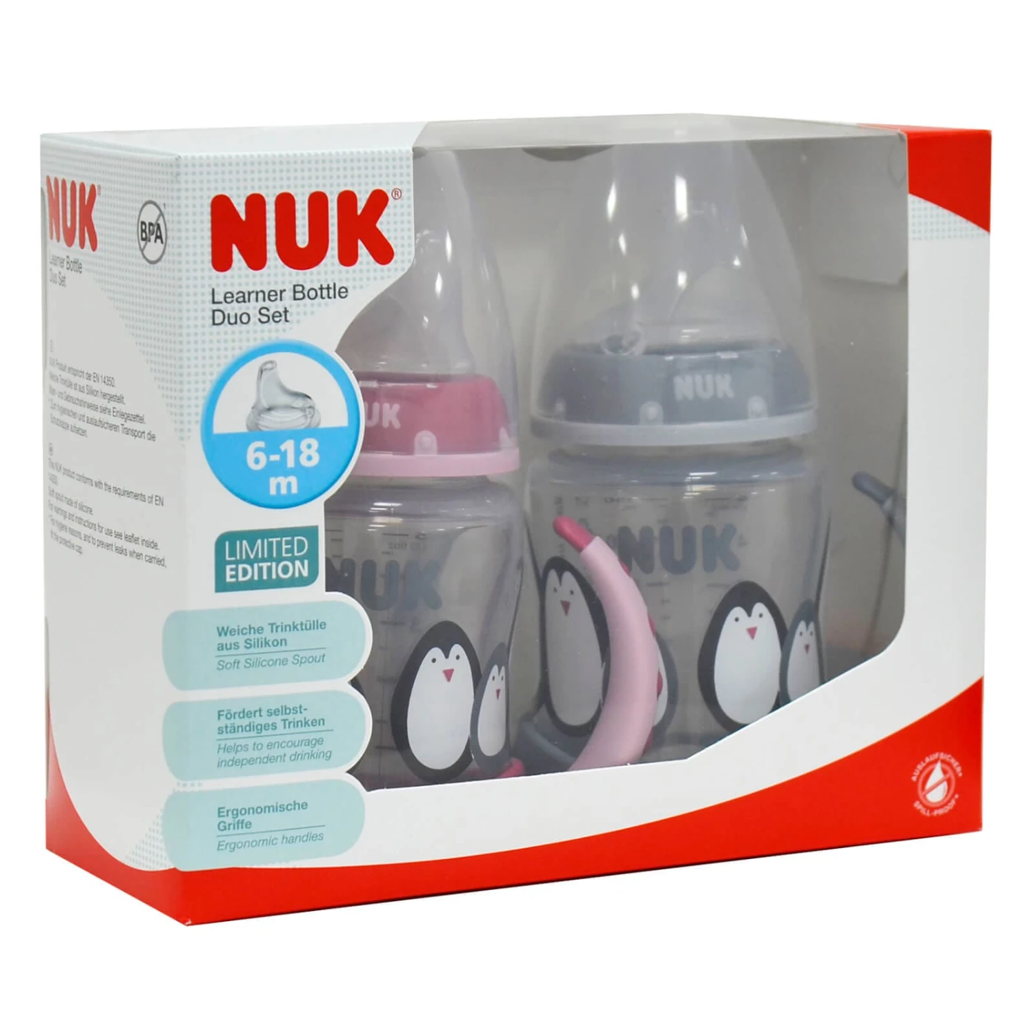 The NUK Learner Bottle Duo Set helps your little one move on easily to independent drinking. The soft and spillproof silicone spout provides a comforting drinking sensation.