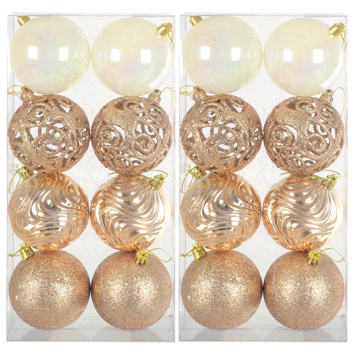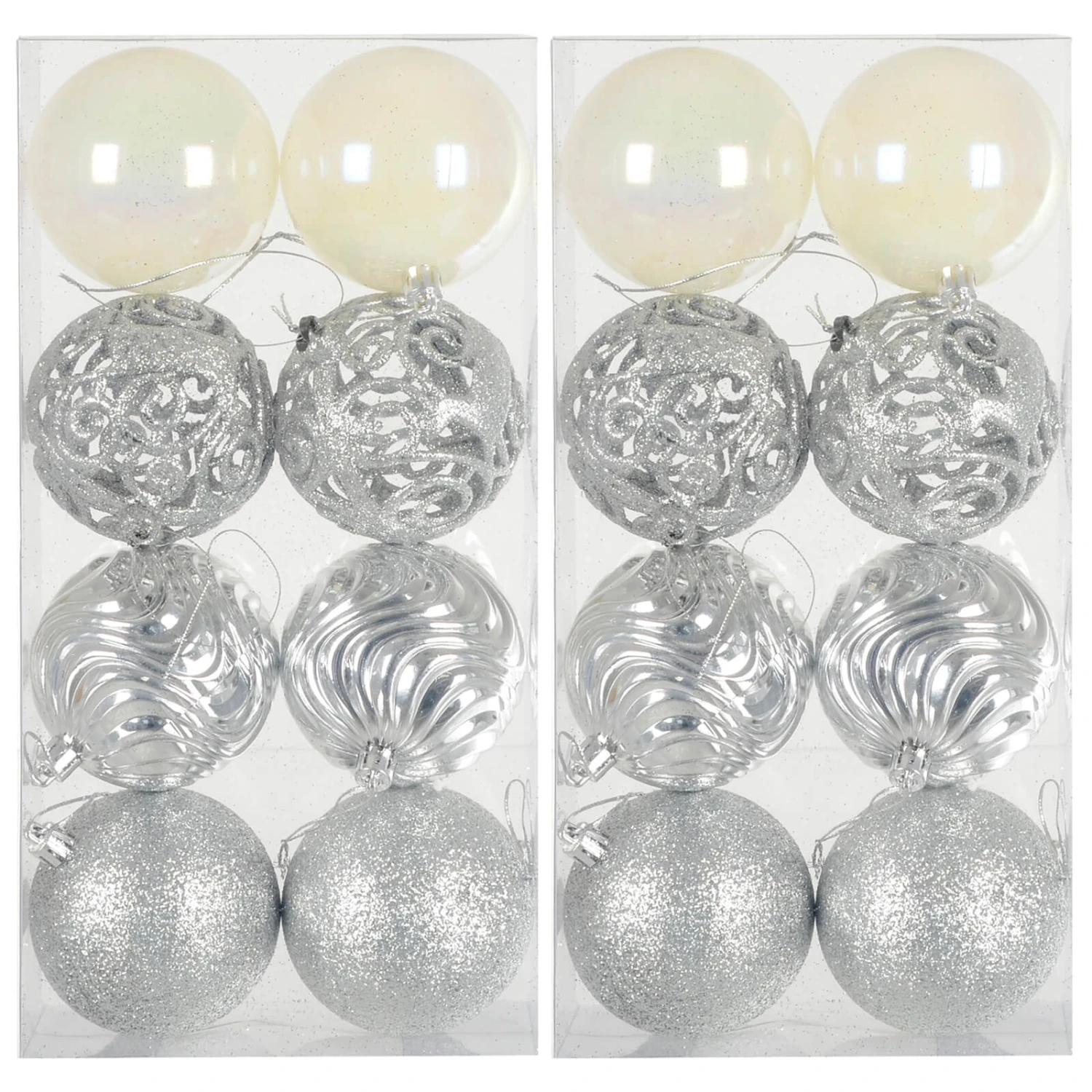 The pack contains 16 x 8cm baubles in 4 designs including pearlised white. Available in a choice of festive colours to match your Christmas decor. Each bauble comes with gold or silver string already attached for hanging. Perfect for xmas trees and garlands throughout your home.