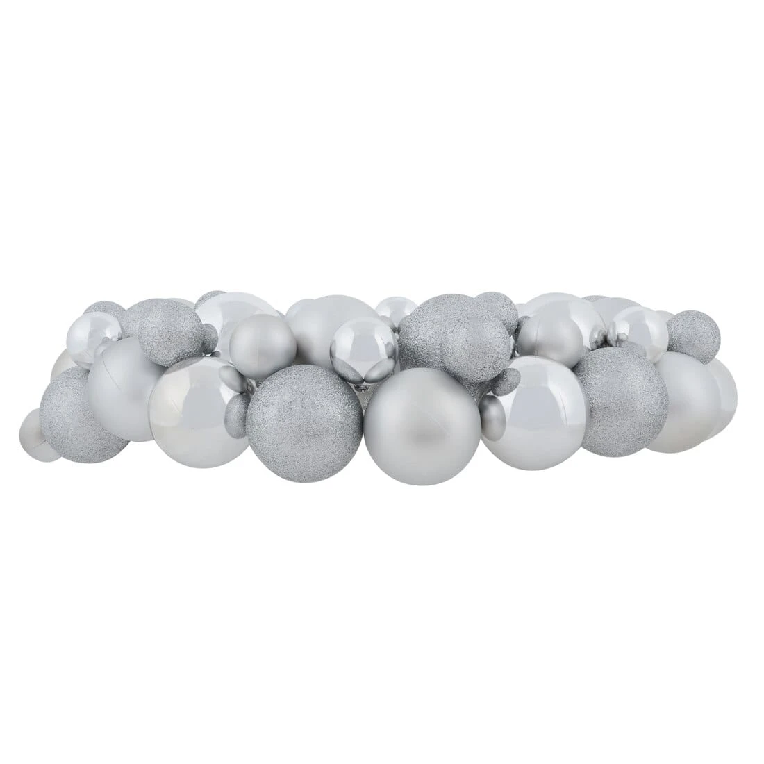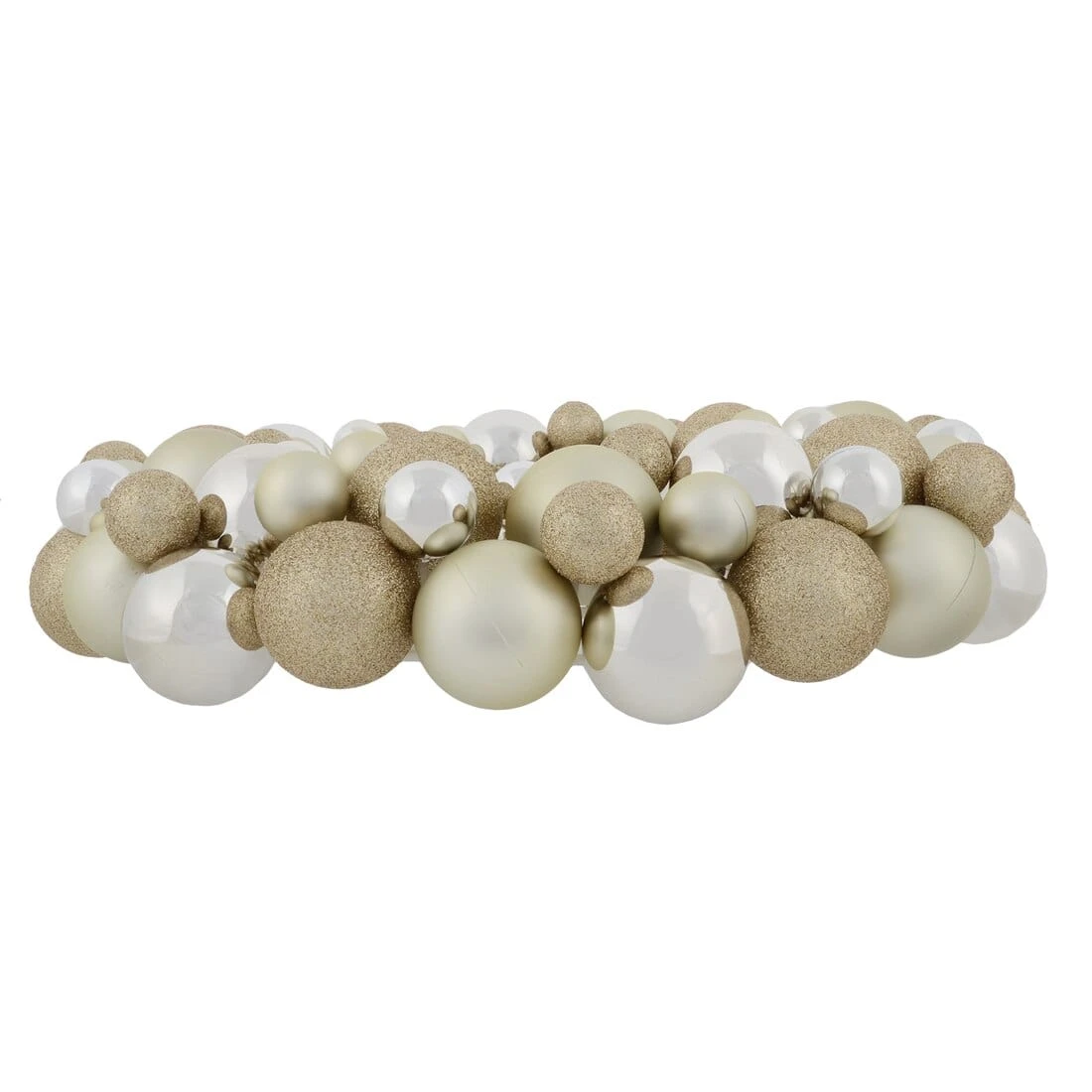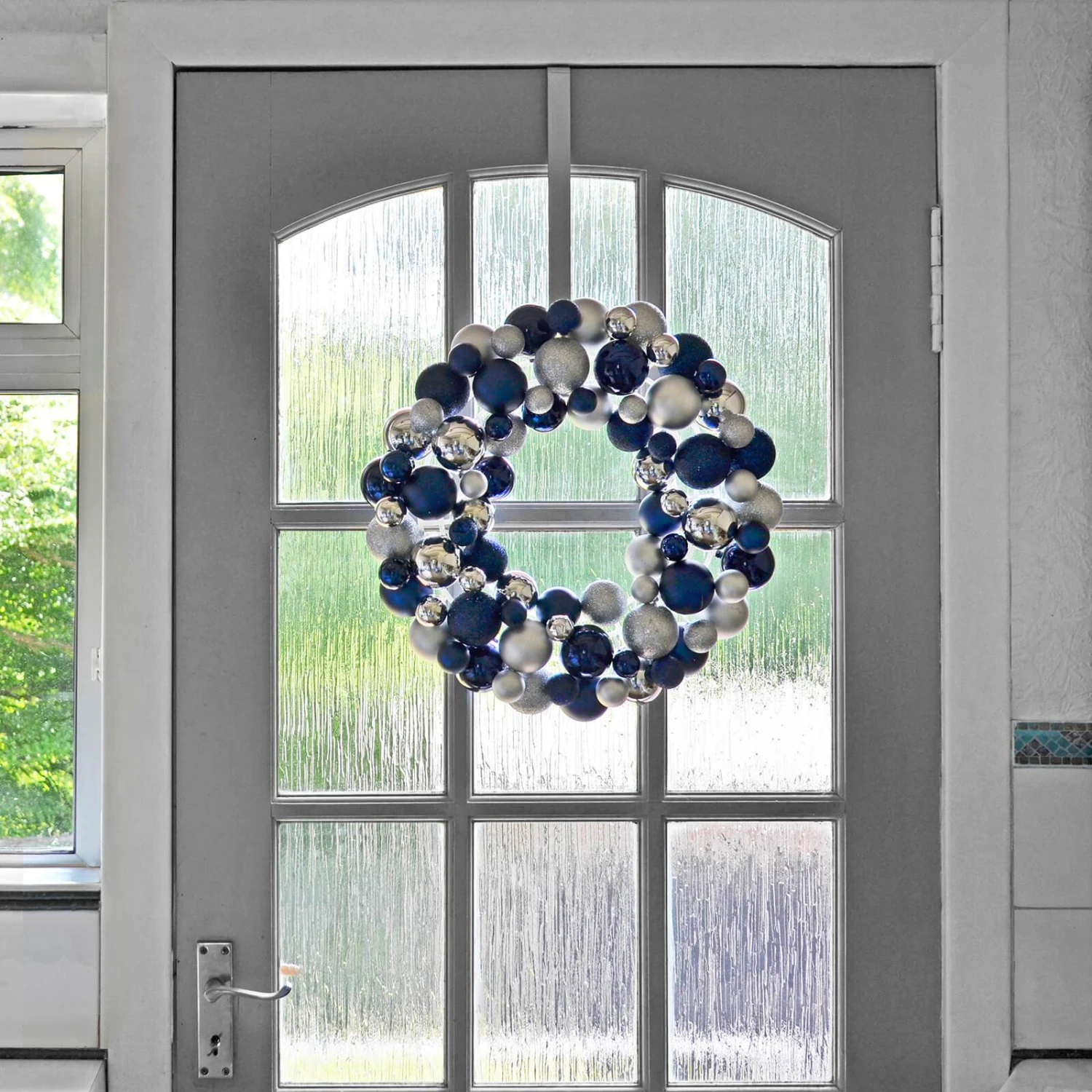 The wreath Diameter measures approximately 45cm (18″) and the depth is approximately 8.5cm (3.5″). The baubles are mounted on a durable plastic frame that can be hung from hooks on your door or wall. The largest baubles have a diameter of 6cm.