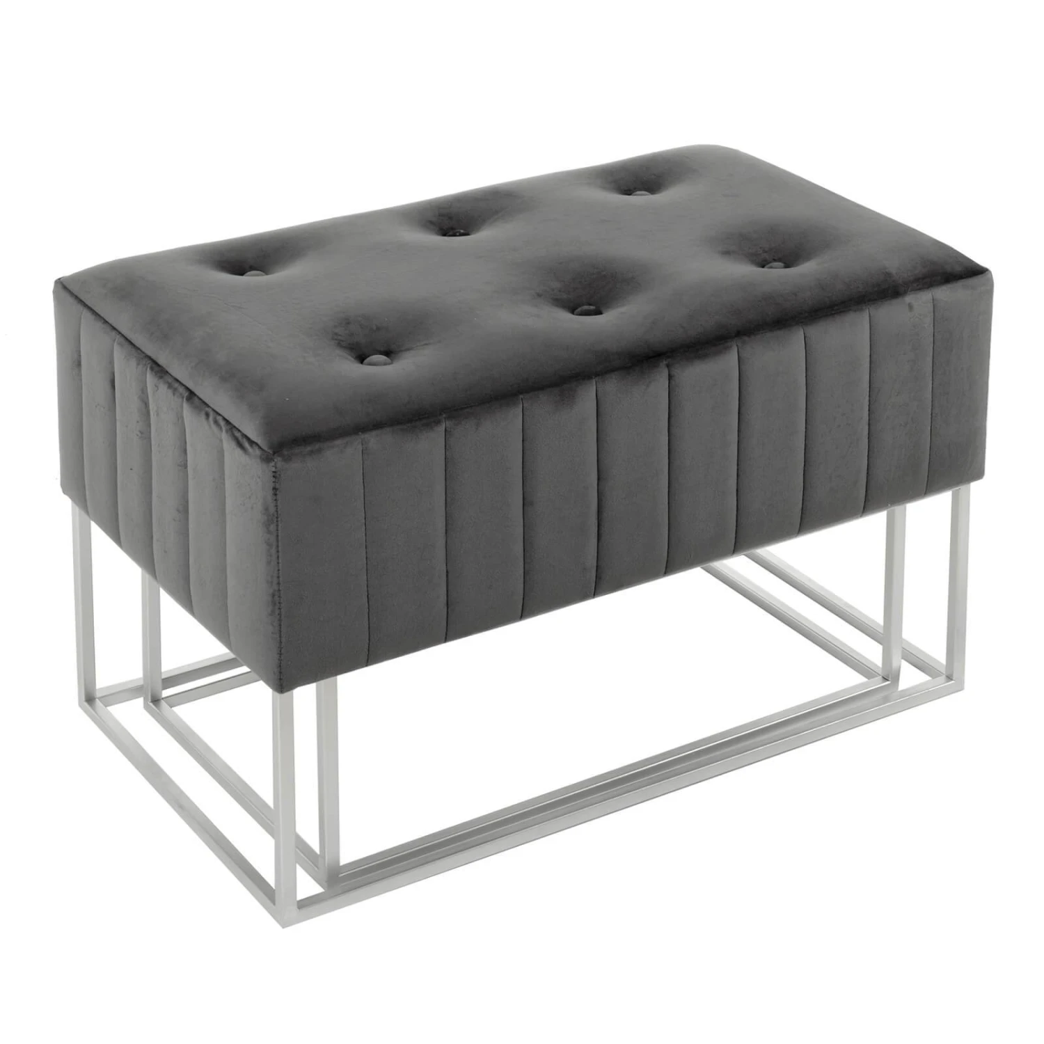 The Juliet design set of 2 nesting stools from the Hodge & Hodge range can be used as vanity seats, footstools, pouffes or a handy table for the drinks tray. Each rectangular shape nesting stool is upholstered in high quality plush velvet with channel sides and button tufting finish on top. With silver metal frame legs the nesting seats are perfect as functional, accent furniture for your living room or bedroom.