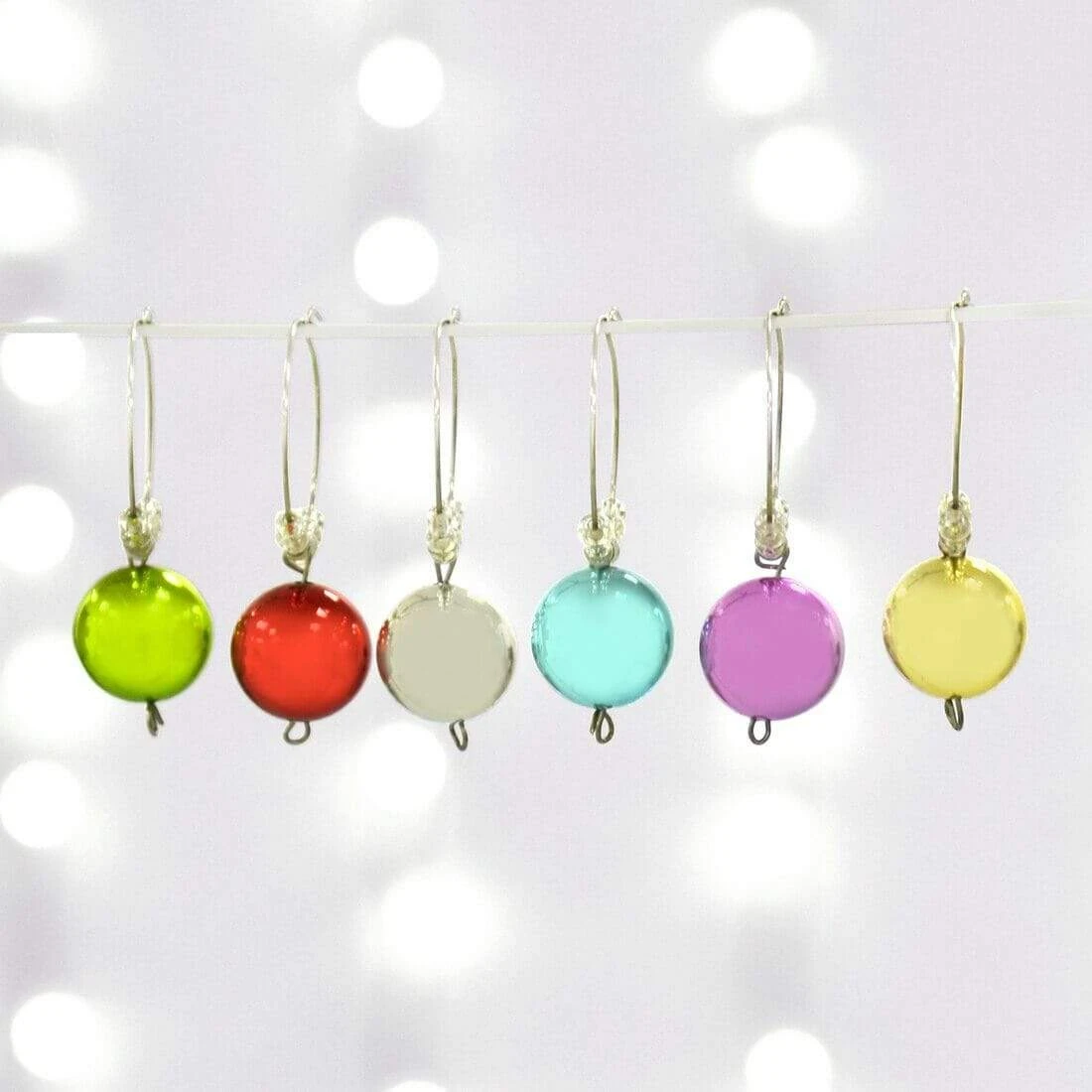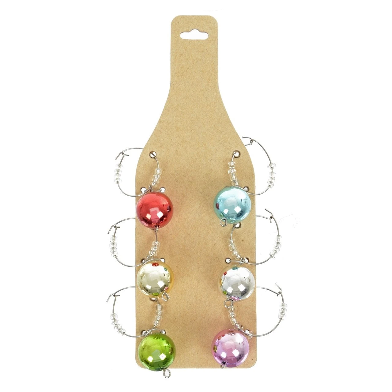 Bring the spirit of Christmas to your wine glasses with a set of 6 shiny bauble charms. The traditional style Christmas tree balls are red, green, blue, yellow, pink and silver. The silver rings are decorated with clear glass beads. Perfect for a festive party!