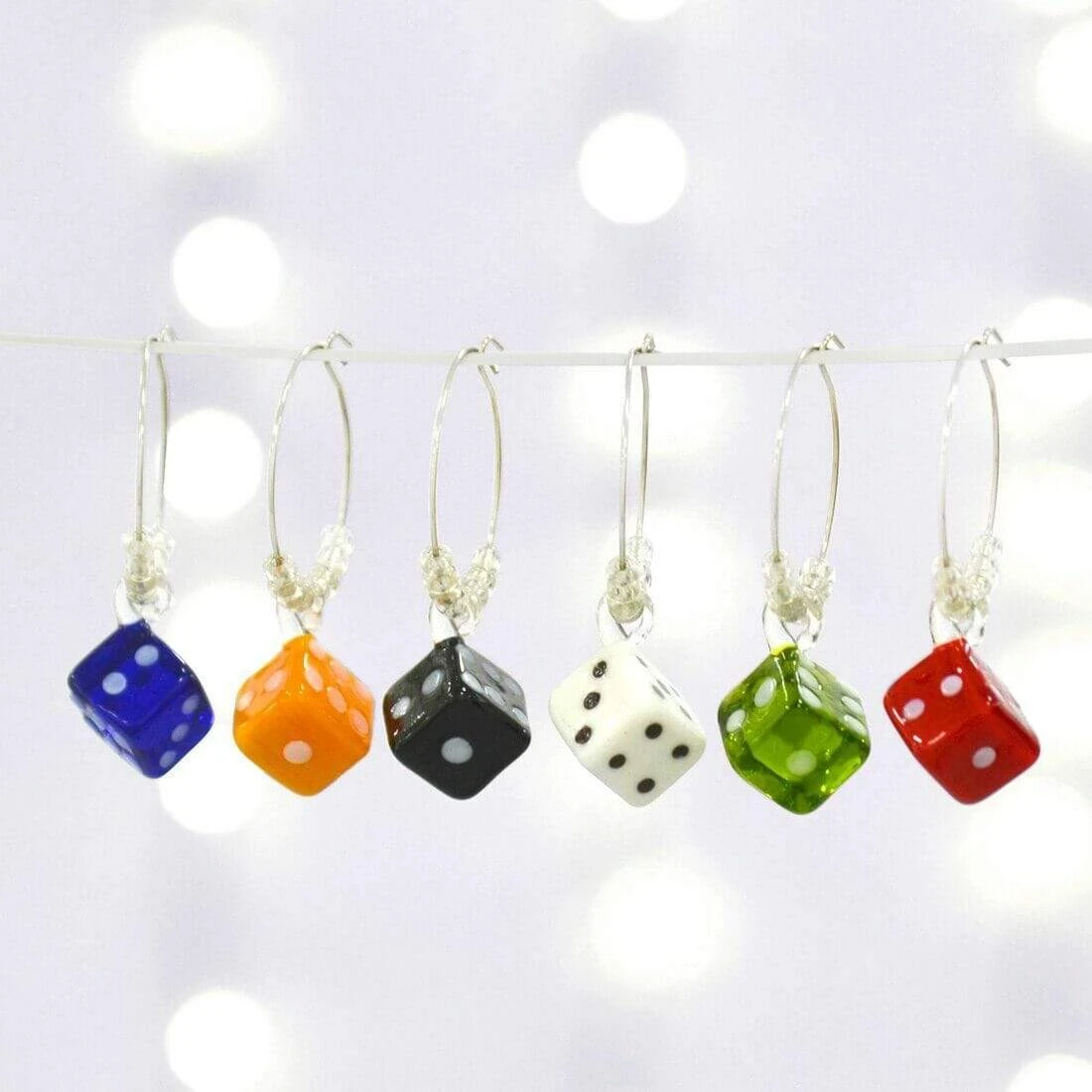 Hosting a game night? A set of 6 novelty dice wine glass charms is sure to be a winner with your guests! Featuring green, red, blue, yellow, black and white glass dice with clear glass beads on the silver rings.