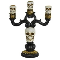 3 Candle Skull Candelabra Black Gold Halloween Decoration 30cm