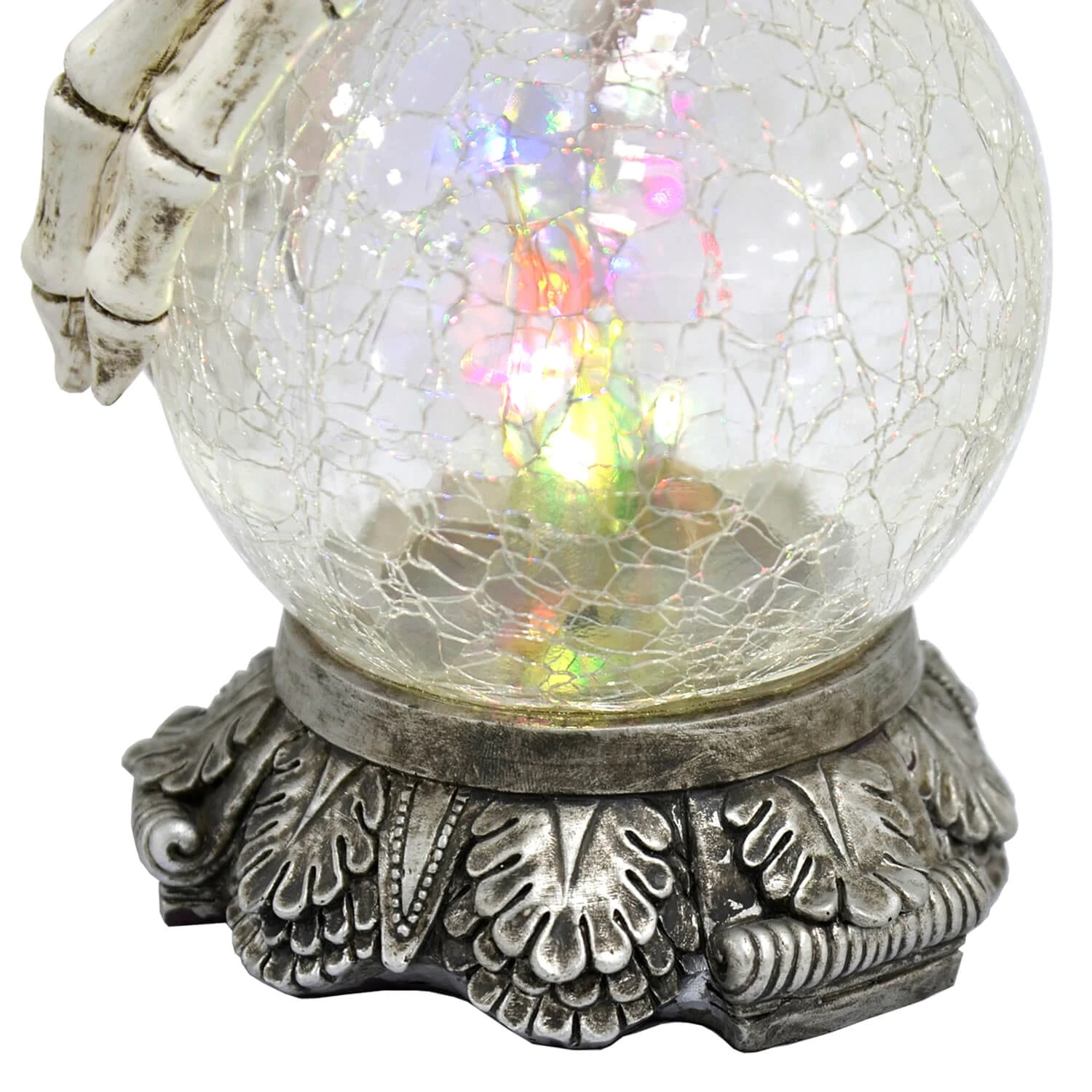 The Halloween crackle glass ball decoration is lit by 8 colour changing LED lights. Ideal for a ghoulish glow all around it. A skeleton hand complete with gold ring and top hat, cradles the light up glass orb. Made from glass and durable resin this decoration stands 20cm (8″) tall. Perfect for a windowsill, porch or the treats table.