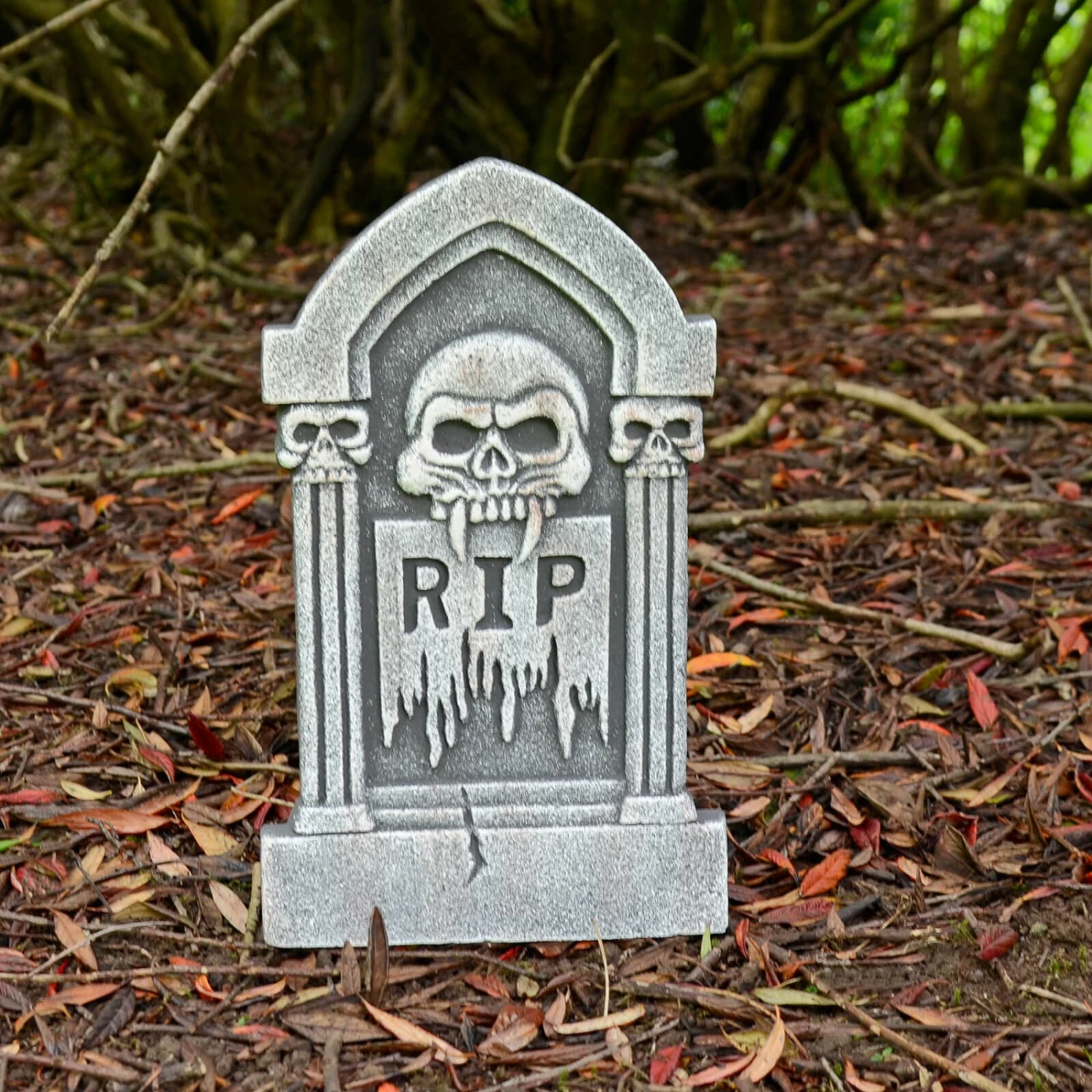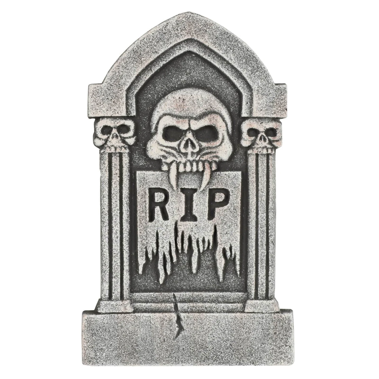 The arch shape 38cm (15″) gravestone is designed with a vampire skull, RIP and skull topped pillars. The weatherbeaten grey granite finish makes it look very realistic. Made from water resistant polyfoam this tombstone is suitable for indoor and outdoor use.