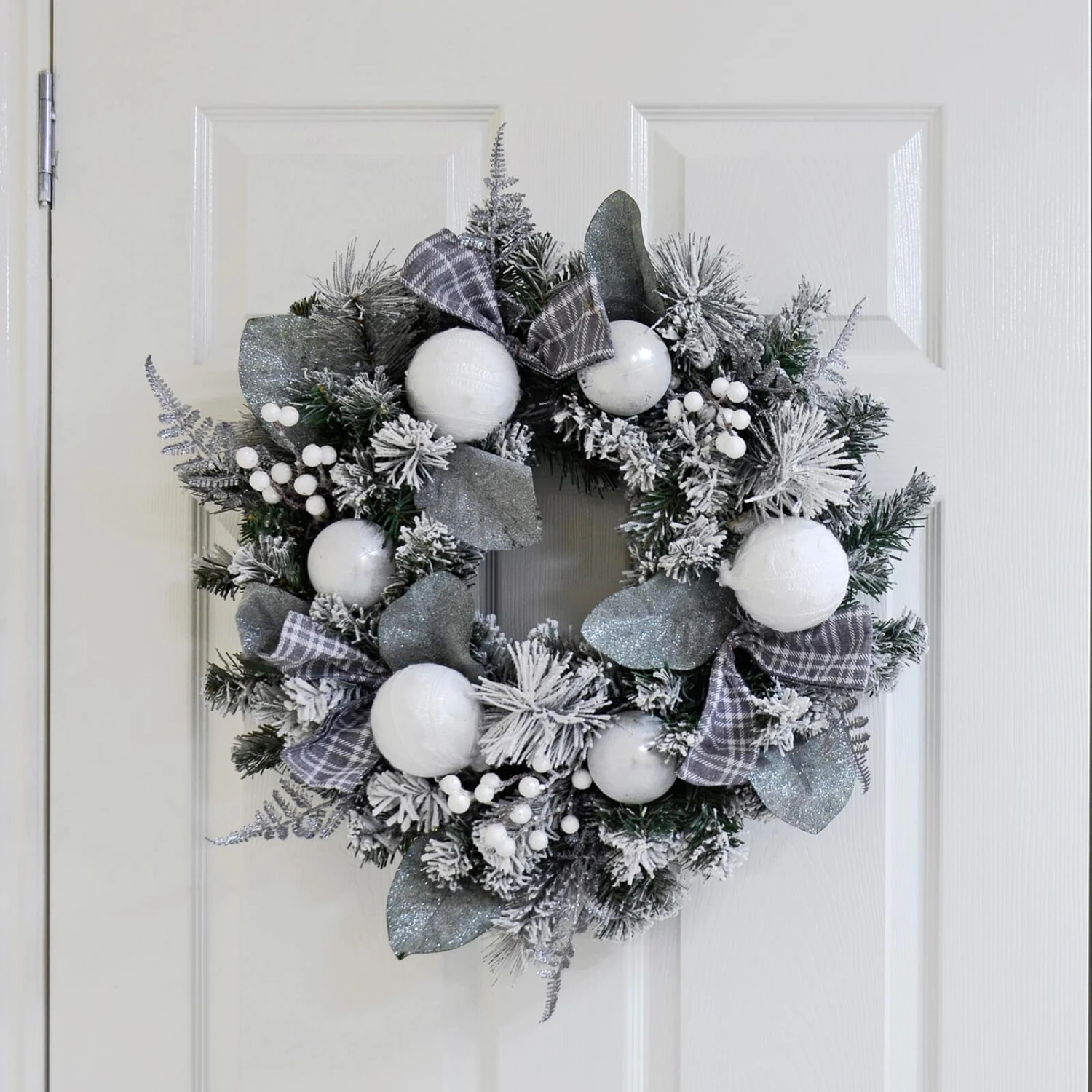 Welcome guests to your home this Christmas with this stunning white, grey and silver wreath from Mr Crimbo. The artificial mixed pine foliage is covered in flocked snow and decorated in grey and white accessories, including three grey tartan bows, large white knitted baubles, silver glitter baubles and bunches of white berries. It will look stunning on your door or above your fireplace over the festive season!