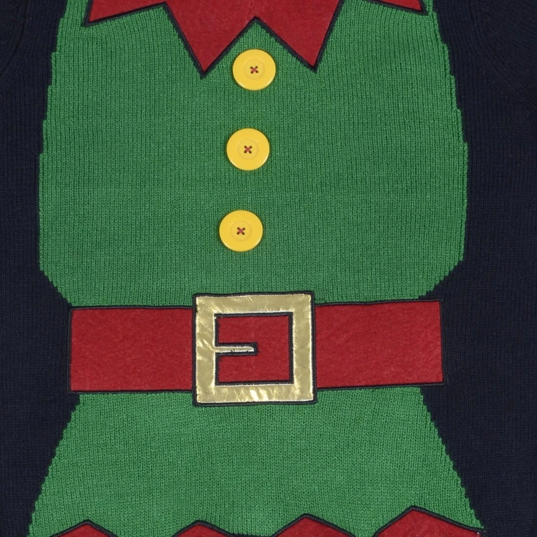 Each knitted jumper features a black front, green back and green hood with a pompom. The long sleeves have red and white stripes and the front of the jumper has been designed to look like an elves body with yellow buttons and hanging legs. So cute and festive!