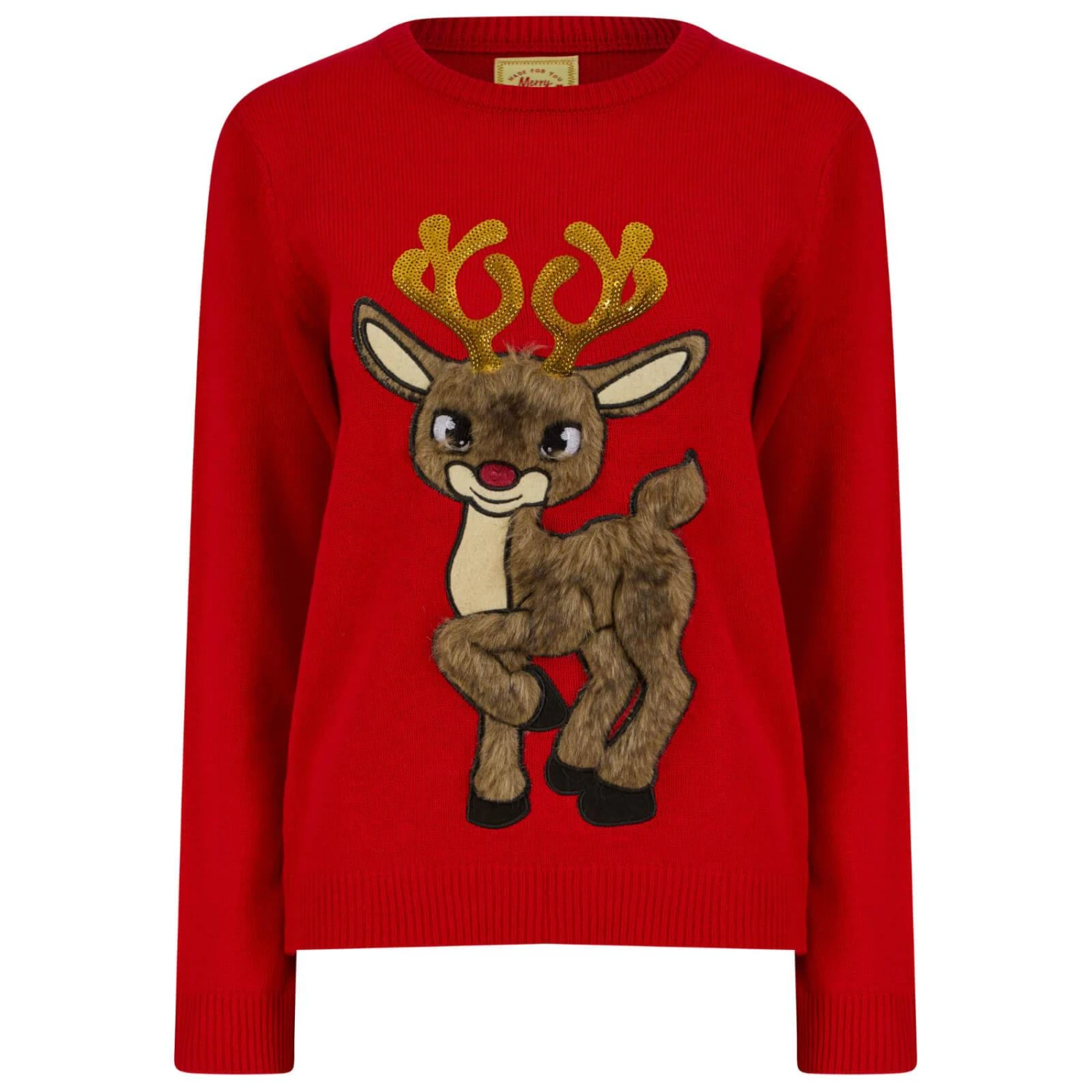 This fabulous ladies Christmas jumper features a very cute happy prancing reindeer complete with a red nose, gold sequin antlers and a faux fur face and body.