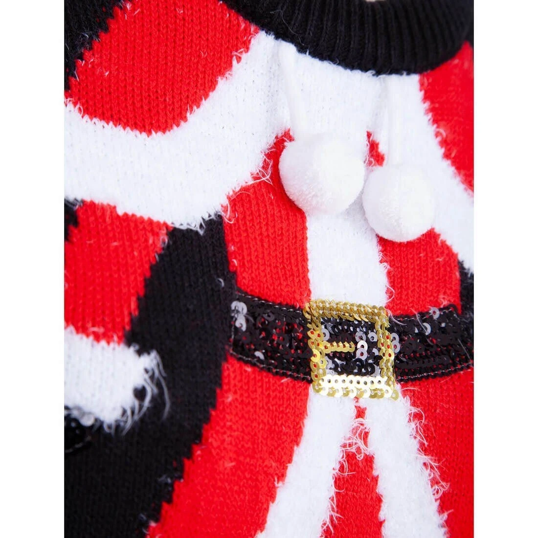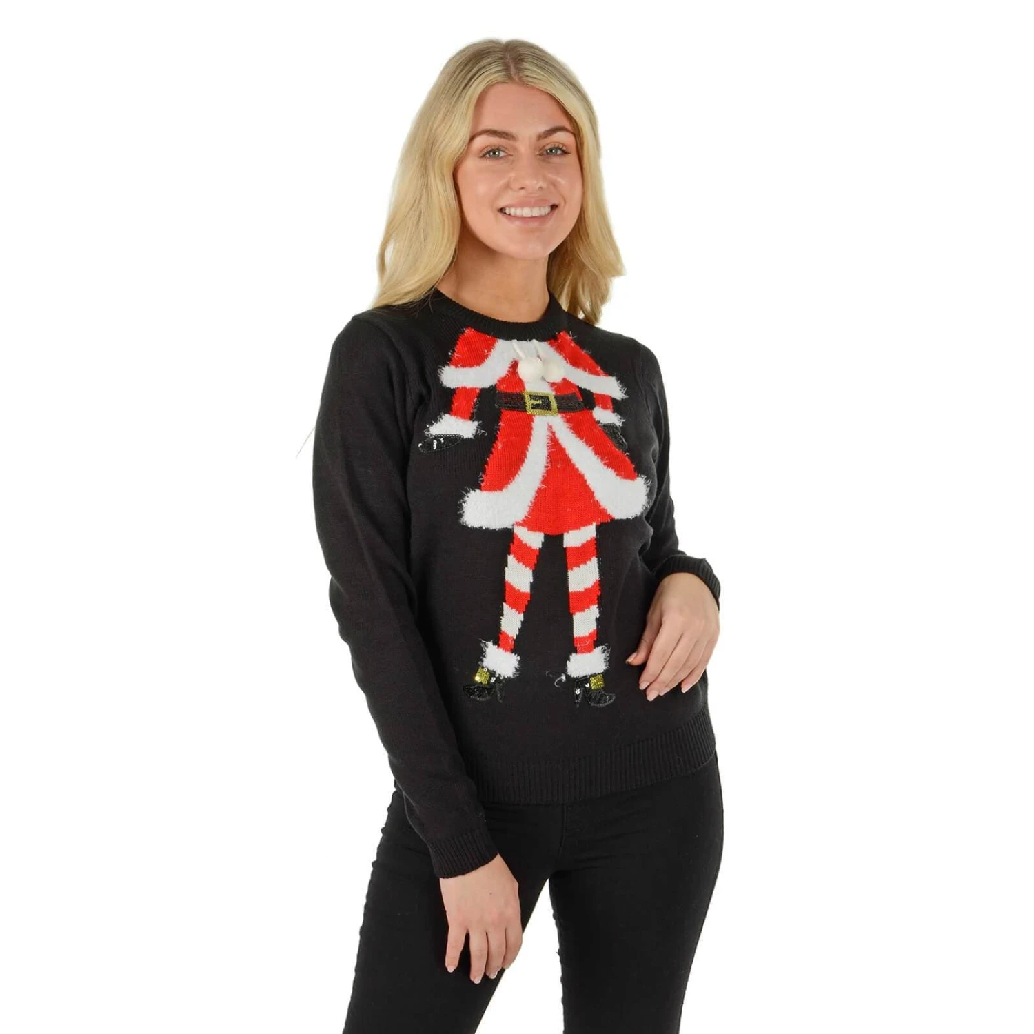 Get into the festive spirit with this novelty Christmas jumper for women. The black xmas sweater features Mrs Claus in red and white, with sparkling sequin boots and white pom poms.