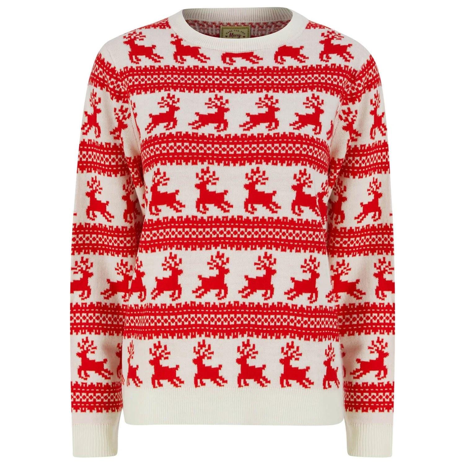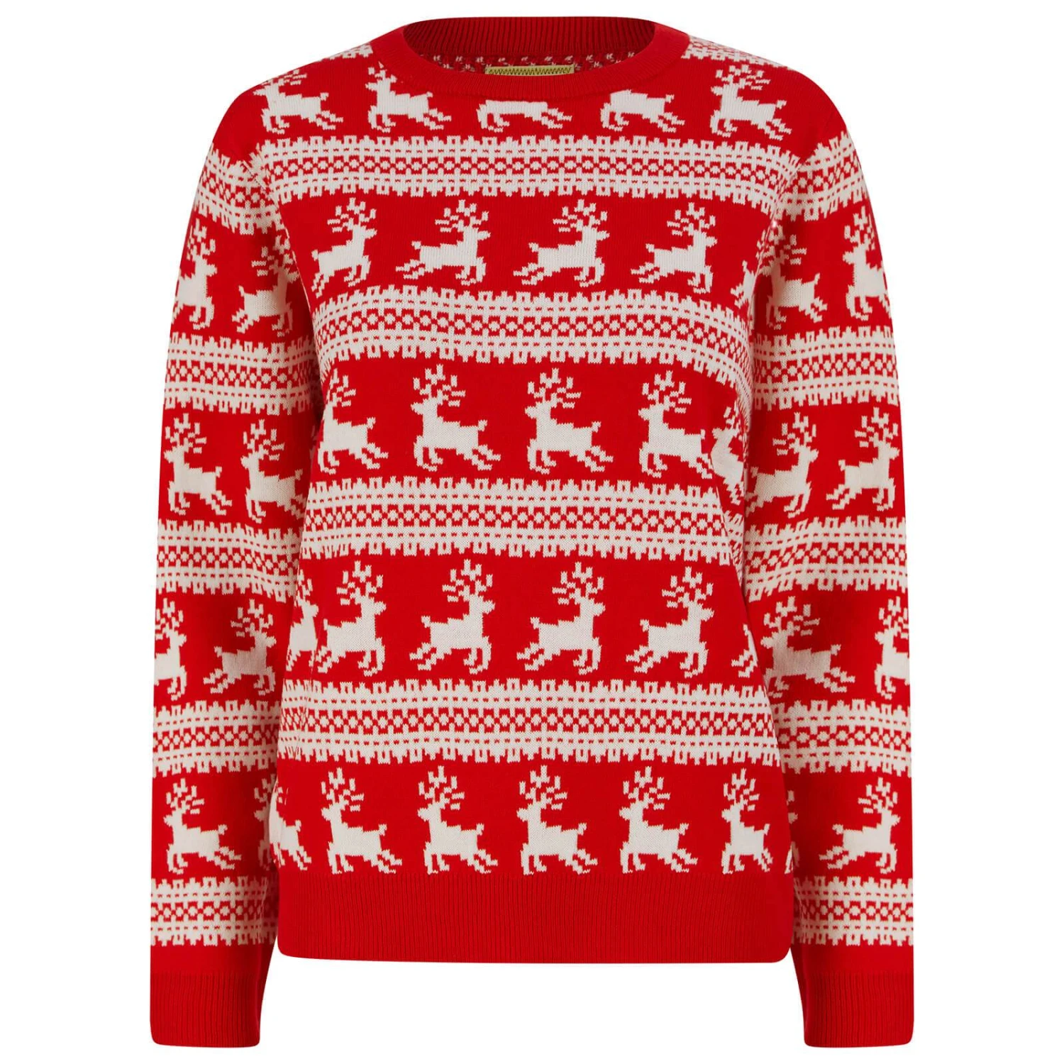 This bold pattern Christmas jumper for women features leaping reindeer and Nordic style pattern bands. Choose from red or gardenia