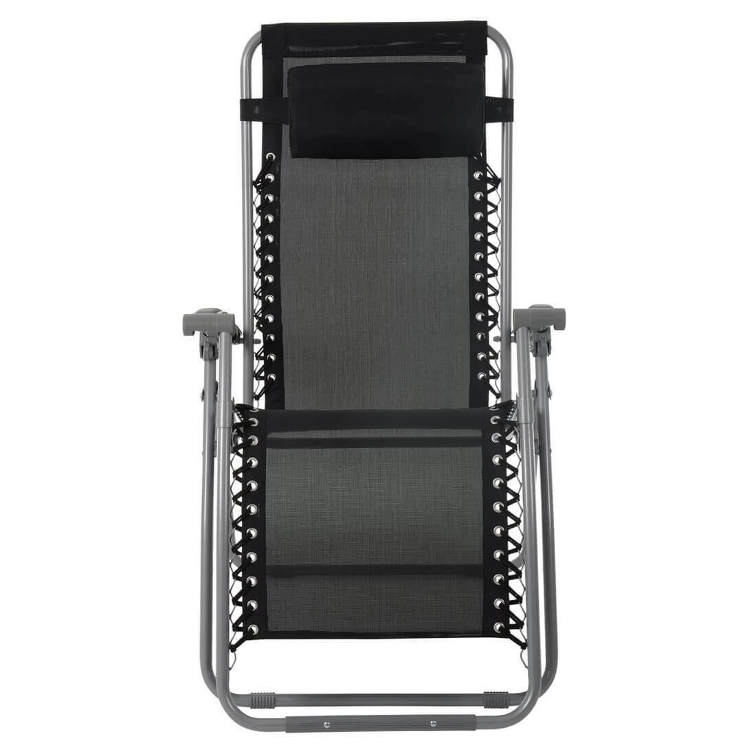 This Azuma zero gravity sun lounger is made from black hard wearing texteline material. Texteline is UV resistant, comfortable to sit on and easy to clean with a cloth and warm soapy water. The seat is attached to a strong silver powder coated tubular steel frame with elastic cords. The silver frame features silver plastic arm rests and anti-rust screws with plastic caps. The adjustable headrest pillow can be removed using the hook and loop fastener on the elastic belt.